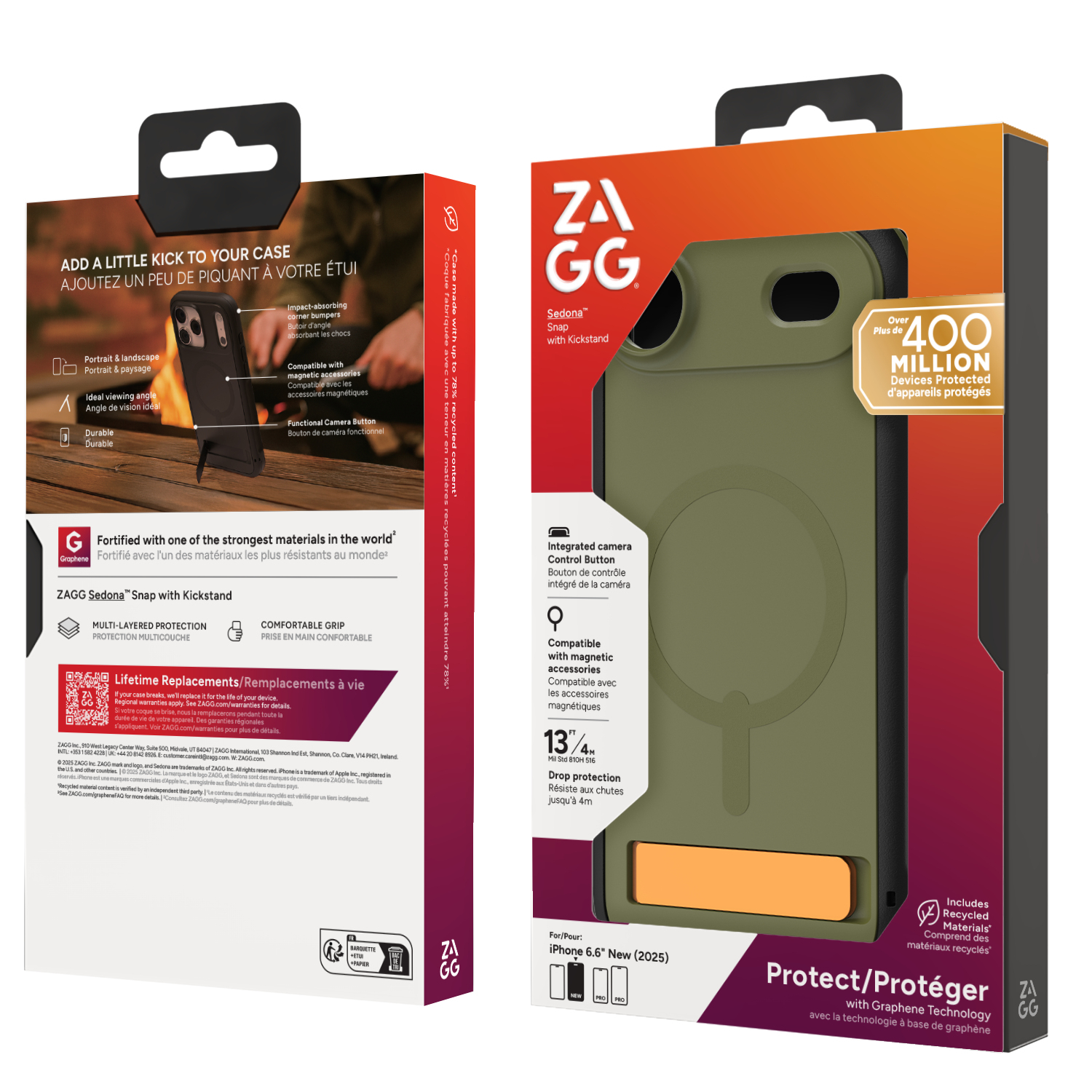 ZAGG Sedona Snap Kickstand. Type etui: Hoes, Merkcompatibiliteit: Apple, Compatibiliteit: iPhone 17 Air, Maximale schermgrootte: 16,5 cm (6.5"), Kleur van het product: Groen, Bureaustandaard