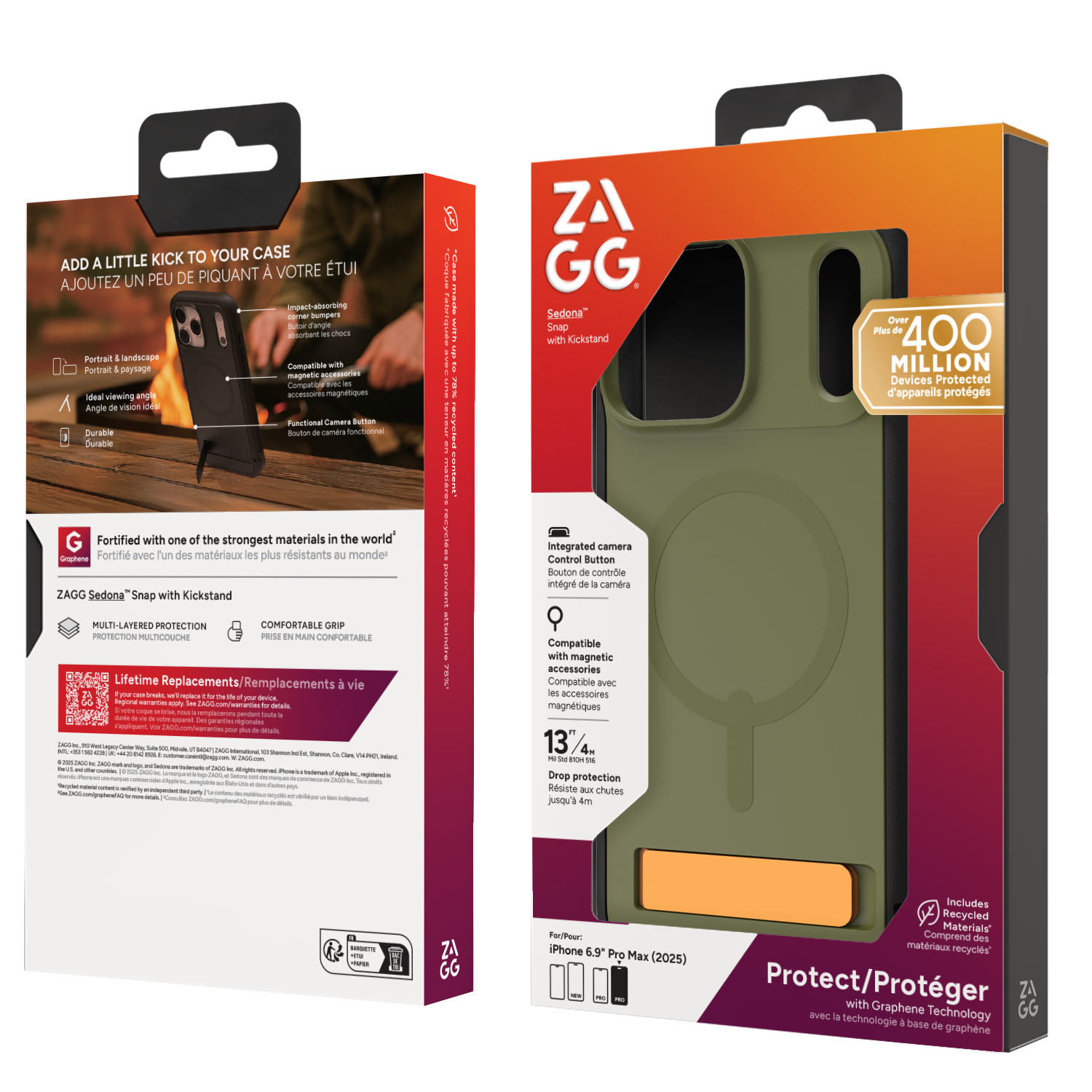 ZAGG Sedona Snap Kickstand. Type etui: Hoes, Merkcompatibiliteit: Apple, Compatibiliteit: iPhone 17 Pro Max, Maximale schermgrootte: 17,5 cm (6.9"), Kleur van het product: Groen, Bureaustandaard