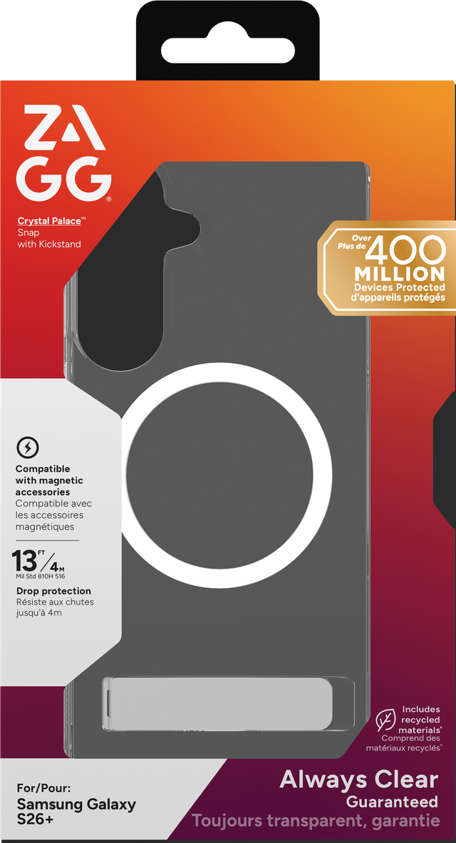 ZAGG Crystal Palace Snap KS. Type etui: Hoes, Merkcompatibiliteit: Samsung, Compatibiliteit: Galaxy S26+, Maximale schermgrootte: 17 cm (6.7"), Kleur van het product: Transparant, Bureaustandaard