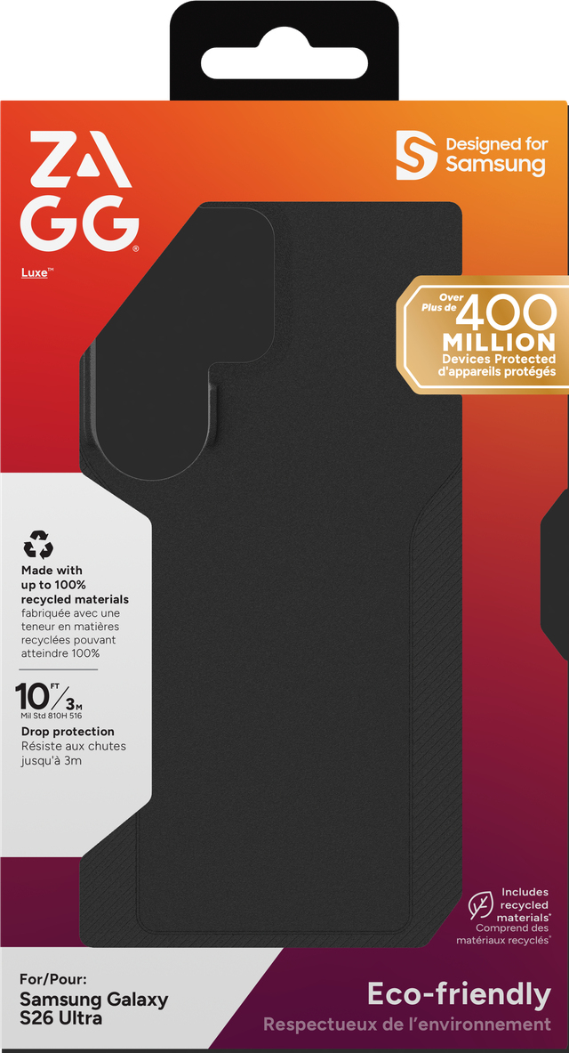 ZAGG Luxe. Type etui: Hoes, Merkcompatibiliteit: Samsung, Compatibiliteit: Galaxy S26 Ultra, Maximale schermgrootte: 17,5 cm (6.9"), Oppervlakte kleur: Monochromatisch, Kleur van het product: Zwart