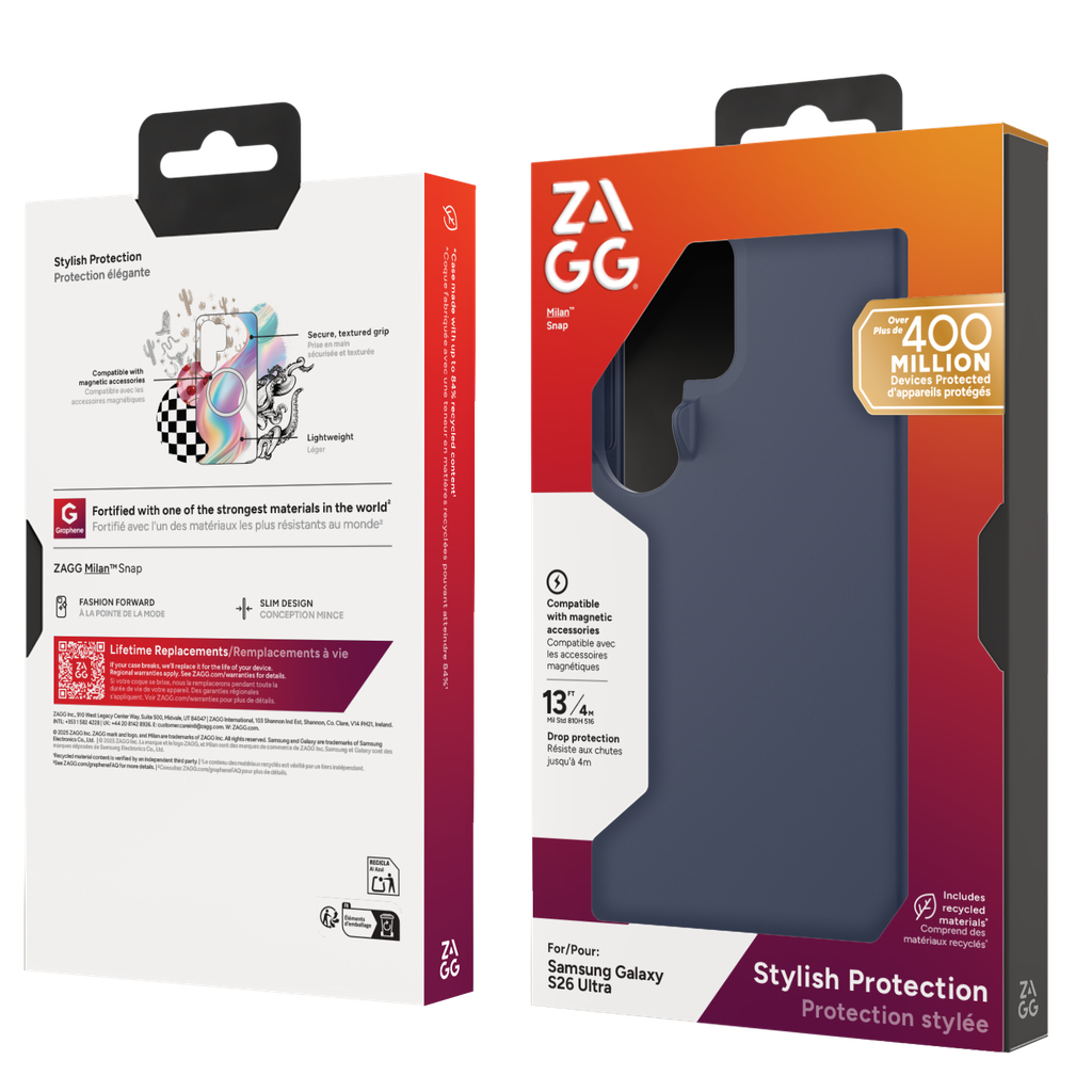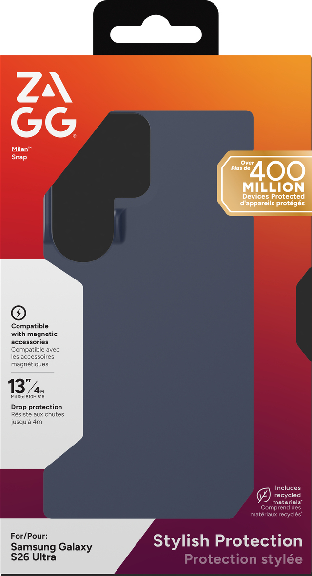 ZAGG Milan Snap. Type etui: Hoes, Merkcompatibiliteit: Samsung, Compatibiliteit: Galaxy S26 Ultra, Maximale schermgrootte: 17,5 cm (6.9"), Oppervlakte kleur: Monochromatisch, Kleur van het product: Marineblauw