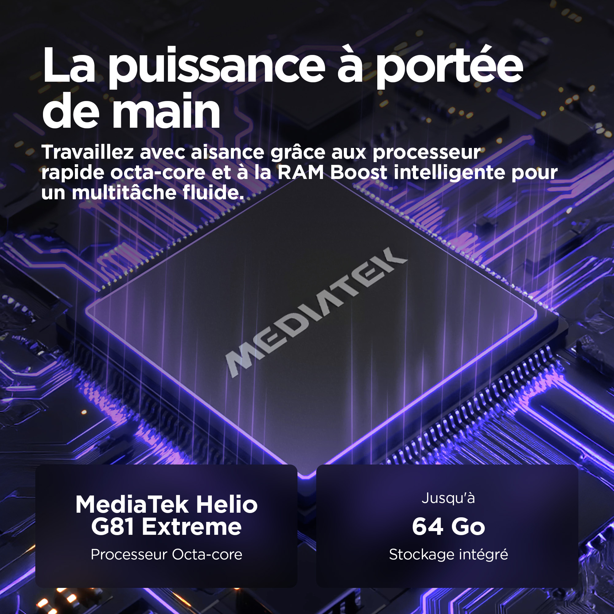 6.67", LCD, 1604 × 720px, MediaTek Helio G81 Extreme, 2GB LPDDR4X RAM, 64GB, 5200mAh, 4G, 32MP, 8MP, Bluetooth 5.4, 802.11 a/b/g/n/ac, USB Type-C 2.0, Android 14 (Go edition)