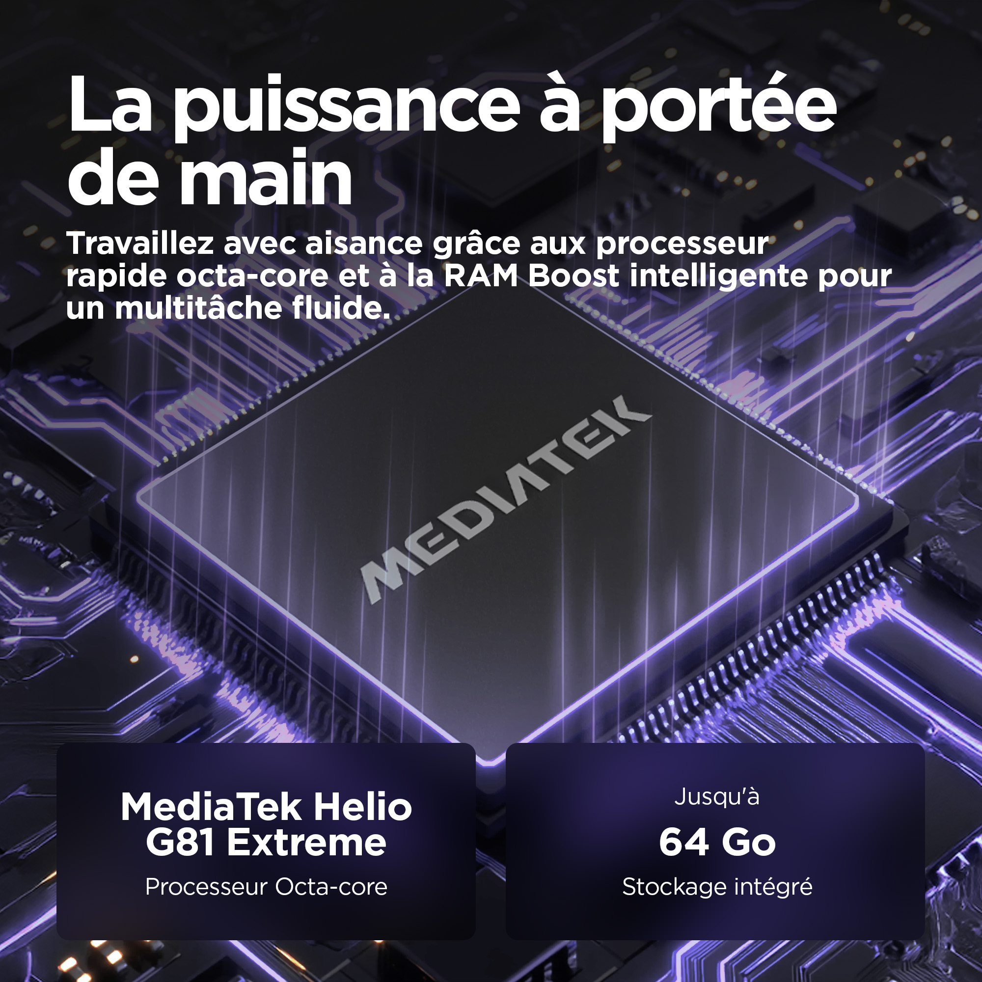 6.67", LCD, 1604 × 720px, MediaTek Helio G81 Extreme, 2GB LPDDR4X RAM, 64GB, 5200mAh, 4G, 32MP, 8MP, Bluetooth 5.4, 802.11 a/b/g/n/ac, USB Type-C 2.0, Android 14 (Go edition)