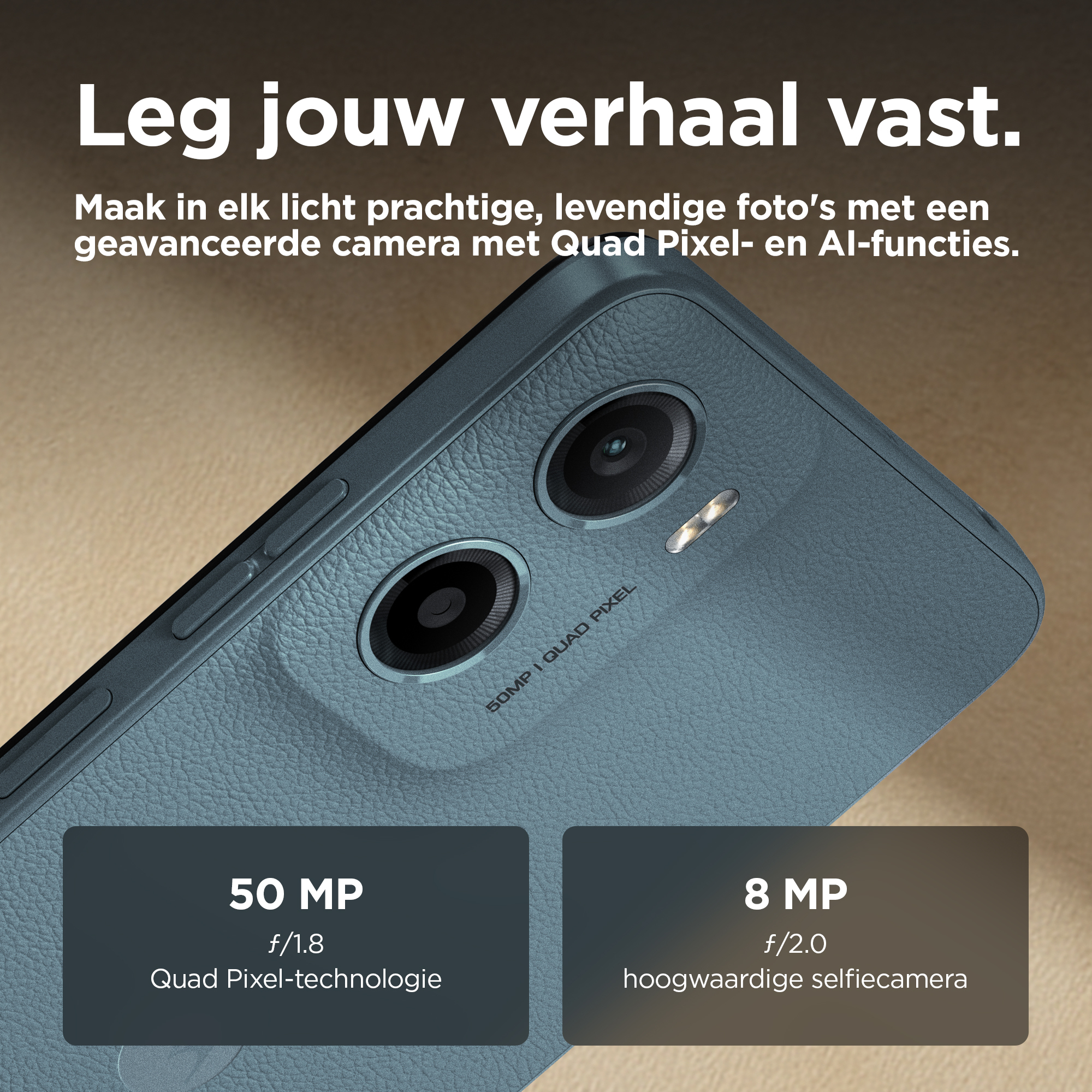 Ervaar adembenemend beeld en geluid met de nieuwe moto g05. Kijk je favoriete series en films op een superhelder display van 6,67 inch zelfs buiten in het zonlicht. En luister naar geluid overal om je heen dankzij krachtige stereoluidsprekers met Basversterking. Maak prachtig scherpe foto's, dag en nacht, met het Quad Pixel-camerasysteem van 50 MP(2) met AI-powered portret. Verhoog je snelheid met superefficiënte prestaties en maximaal 12 GB RAM beschikbaar met RAM-boost(5). Met een afwerking van vegan leer, een waterafstotend design(4) en Corning® Gorilla® Glass 3 gaat de stijlvolle moto g05 lang mee. Vertrouw op een accu van 5200 mAh met een lange accuduur + TurboPower™ opladen. En krijg heel veel opslag voor je content en creaties. De moto g05 is in elk opzicht geweldig.