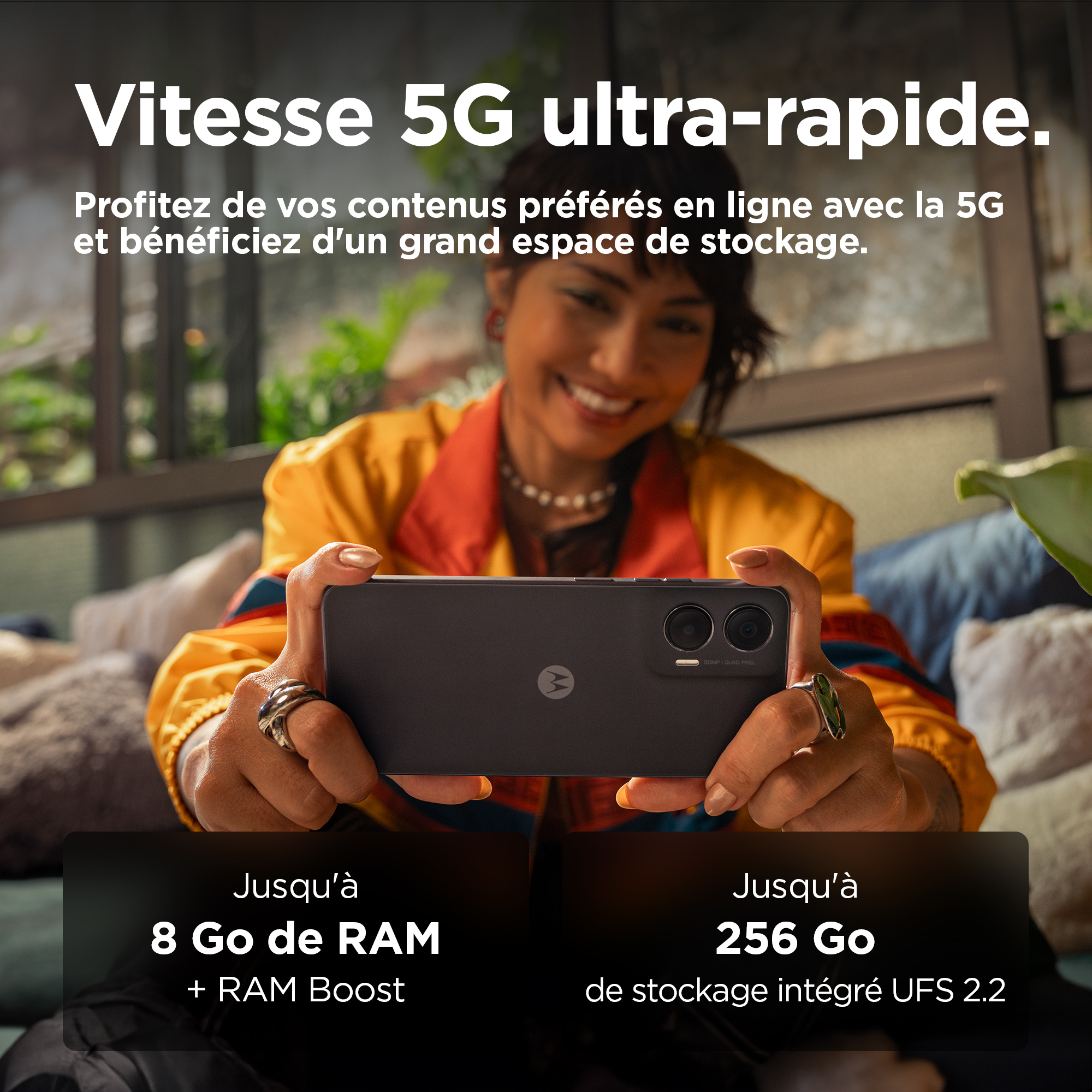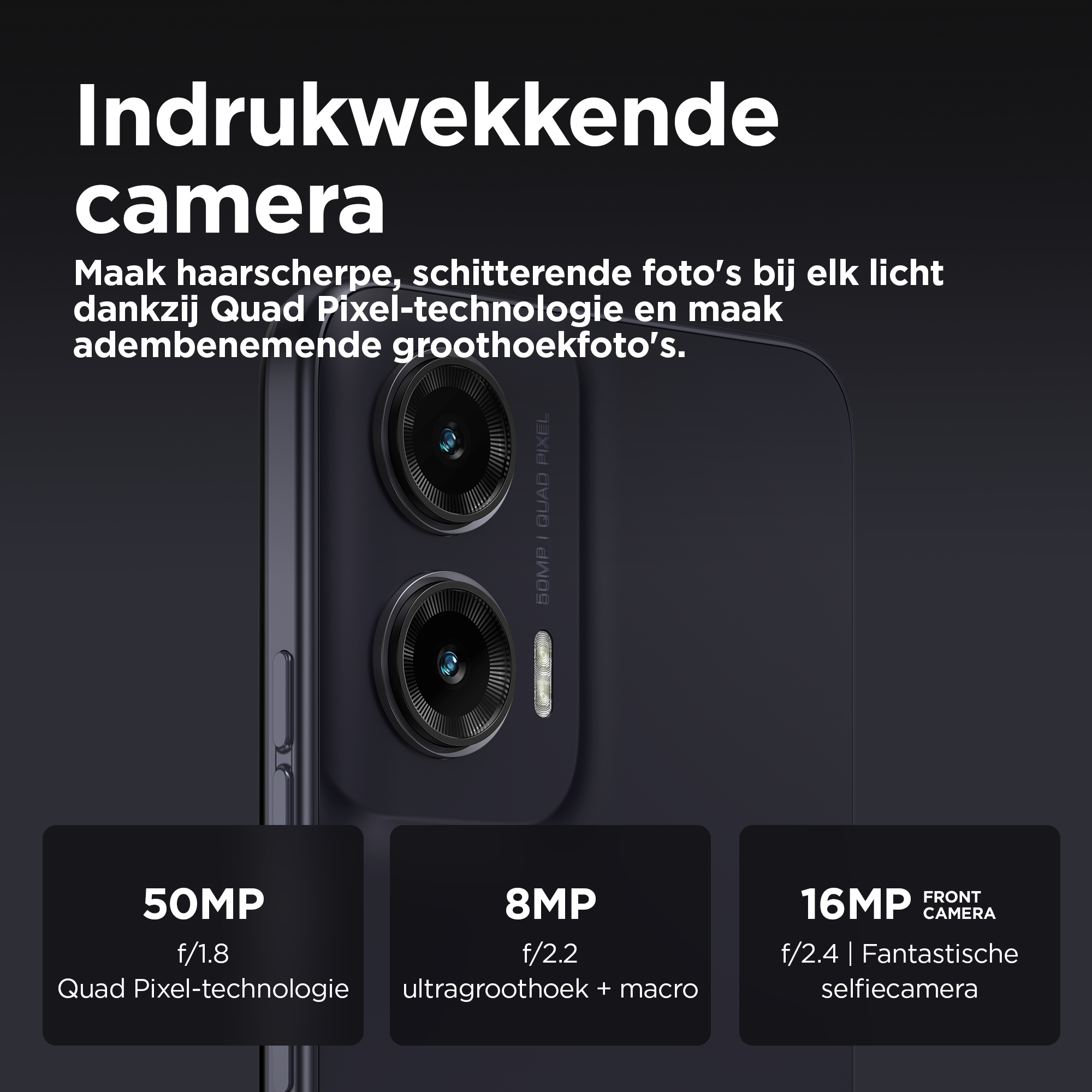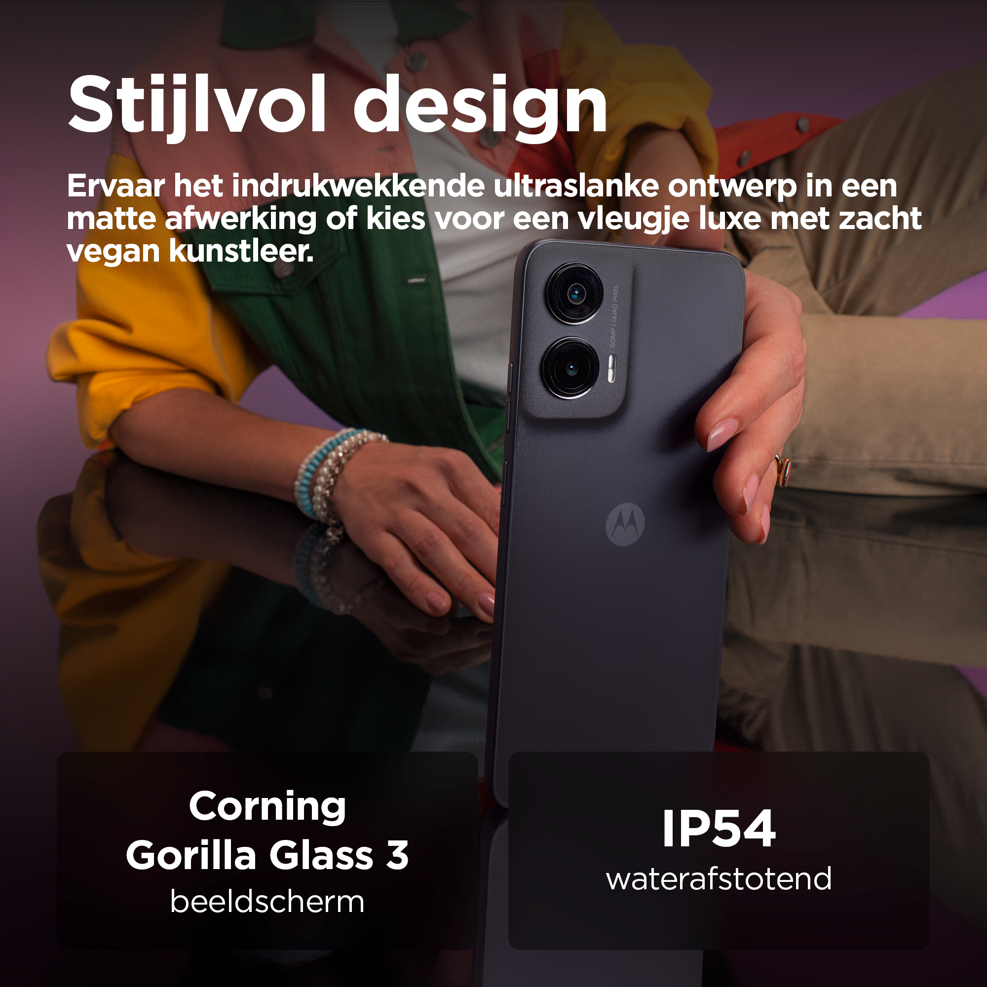 De grootste momenten in het leven verdienen een groot podium. Maak kennis met de moto g35 5G. Met een enorm FHD+-display van 6,72 inch komen je films, games en videogesprekken tot leven, zelfs in helder licht, met een piekhelderheid van 1000 nits. Dat alles wordt aangevuld met multidimensionaal Dolby Atmos®-geluid op stereoluidsprekers of je favoriete hoofdtelefoon. Maak adembenemende opnamen met de ultragroothoeklens of maak scherpe, heldere foto's bij elk licht met de 50 MP-camera met Quad Pixel-technologie. Geniet van het prachtige, superdunne eersteklas design, inclusief een optie met het luxe gevoel van vegan leer. Profiteer van supersnelle 5G met een octa-core processor en krijg 4 GB RAM en maximaal 256 GB opslag.(2,4) Bovendien kun je altijd doorgaan doordat de accu lang meegaat. De moto g35 5G is gemaakt voor grote momenten.