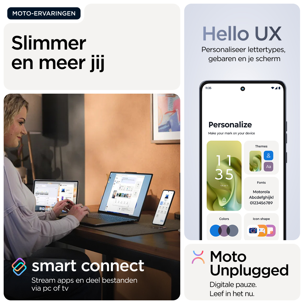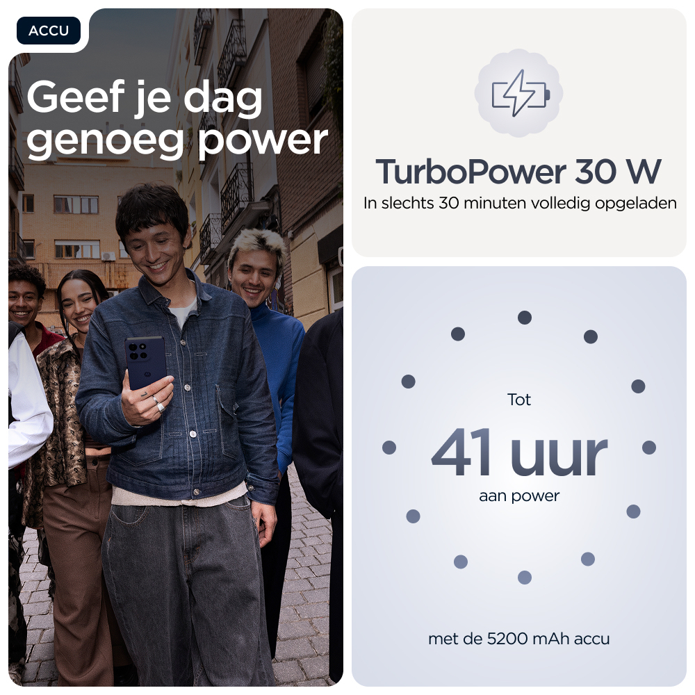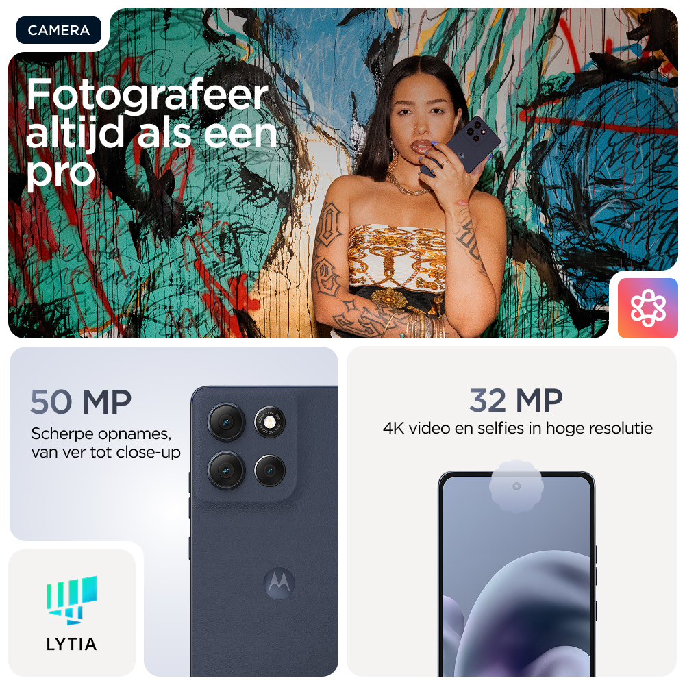 Voor wie grenzen wil verleggen in het leven: maak kennis met de moto g86 5G. Dit model is prachtig vormgegeven met hoogwaardige materialen en valt echt op door z'n opvallende design met geavanceerde water- en valbestendigheid(6,7). Zie alles op een ultra-helder 6,67-inch Super HD (1220p) display met Dolby Atmos®-geluid. Leg prachtige foto's vans met de 50MP Sony LYTIA™ 600-camera met moto ai(12) en maak moeiteloos professionele foto's. Profiteer van 41 uur batterijduur in slechts enkele minuten met TurboPower™ opladen(1,13). Ervaar de kracht van een geavanceerde processor en 8 GB - uitbreidbaar tot 24 GB met RAM-boost - en tot 256 GB aan opslag(3,9). Verhoog je creatieve vrijheid, soepele interactie en gemoedsrust met exclusieve Moto-functies. Geniet van het avontuur in het leven met de moto g86 5G.