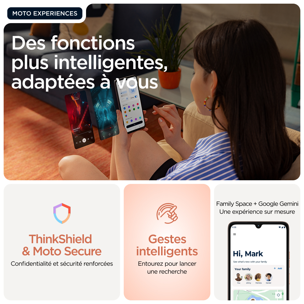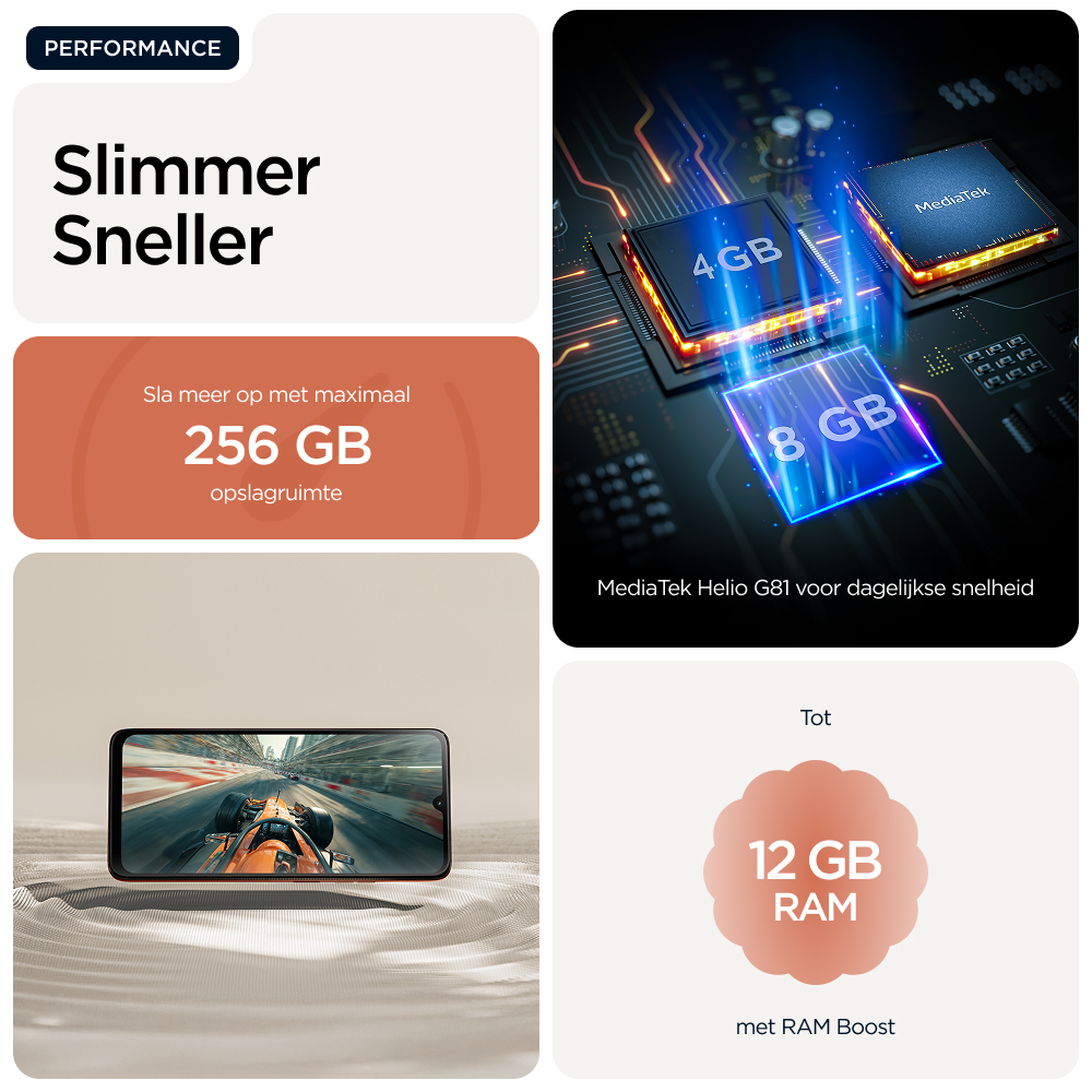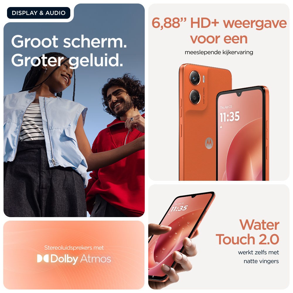 Maak kennis met de moto g06, een smartphone die je verwachtingen overtreft. Breng je favoriete series en films tot leven op een supergroot, helder 6,88-inch display, ons grootste display ooit op de moto g, met stereoluidsprekers en Dolby Atmos®-geluid. Maak schitterende foto's bij elk licht met een 50MP-camerasysteem met AI-technologie.(1) Multitasking wordt superefficiënt met tot 12 GB RAM met RAM-boost.(2,5,6,10) Geniet zonder zorgen van een premium design met geavanceerde robuustheidsfuncties dankzij onder andere IP64-classificatie voor bescherming tegen water(3), Corning® Gorilla® Glass 3 en een veganistische leerfinish. Je smartphone gaat 2 dagen mee op één keer opladen.(4) En je krijgt exclusieve Moto-functies die je smartphone veiliger, persoonlijker en leuker maken. En met Circle to Search kun je alles wat je op je smartphone ziet direct opzoeken. Haal meer uit de moto g06.