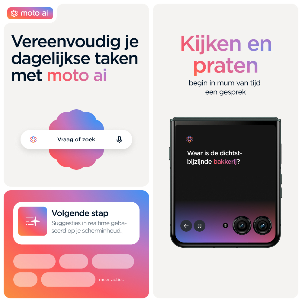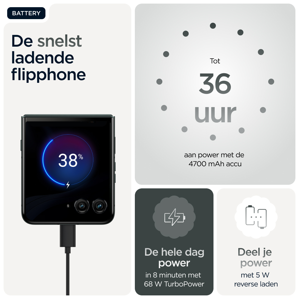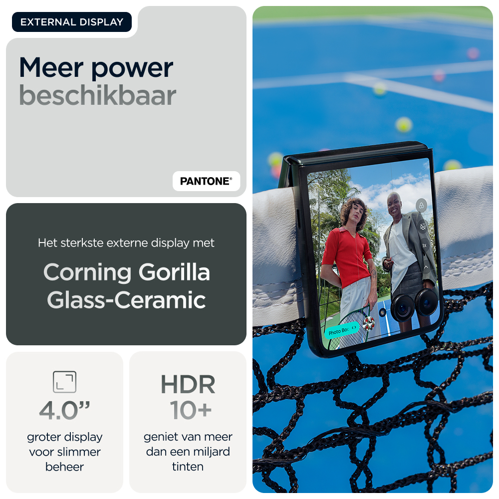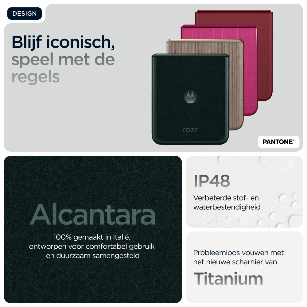 Kies voor slimmer. Kies voor sneller. Kies voor nog iconischer. Maak kennis met de motorola razr 60 ultra. Deze supercompacte en voortreffelijk vervaardigde flipphone is verkrijgbaar met opvallende afwerkingen zoals Alcantara(43) en echt hout, alle in speciaal geselecteerde Pantone-kleuren. Krijg eenvoudig toegang tot je favoriete apps op het meest intelligente en interactieve externe display. Dat alles zonder je smartphone open te klappen. Maak professionele foto's en video's en profiteer van persoonlijke hulp dankzij de naadloze integratie van moto ai(1). Alles gaat sneller met het toonaangevende Snapdragon® AI. En laad sneller op dan met elke andere flipphone(2) dankzij 68 W TurboPower™. De nieuwe motorola razr 60 ultra. Jouw toestel, jouw stijl.