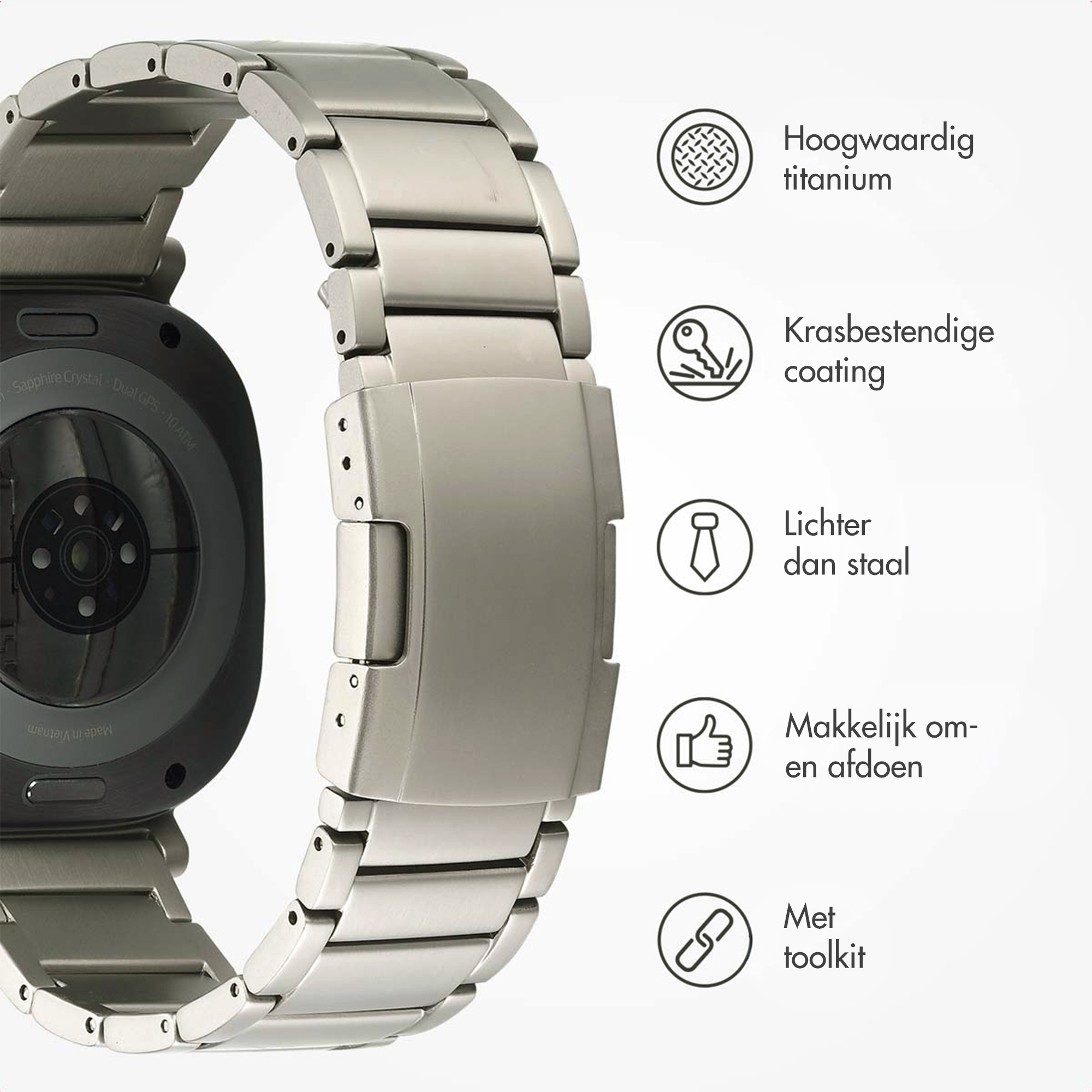 Het Accezz Mat Titanium bandje is een perfecte combinatie van elegantie en robuustheid. Dit bandje, vervaardigd uit hoogwaardig vliegtuig-grade titanium, biedt zowel comfort als duurzaamheid, ideaal voor dagelijks gebruik en actieve bezigheden. Lichtgewicht en comfortabelTitanium staat bekend om zijn lichte gewicht en hoge sterkte, waardoor dit bandje uitzonderlijk comfortabel is om te dragen, zelfs tijdens langdurig gebruik.