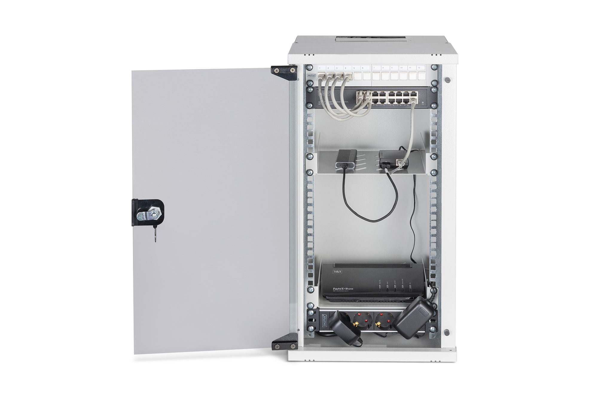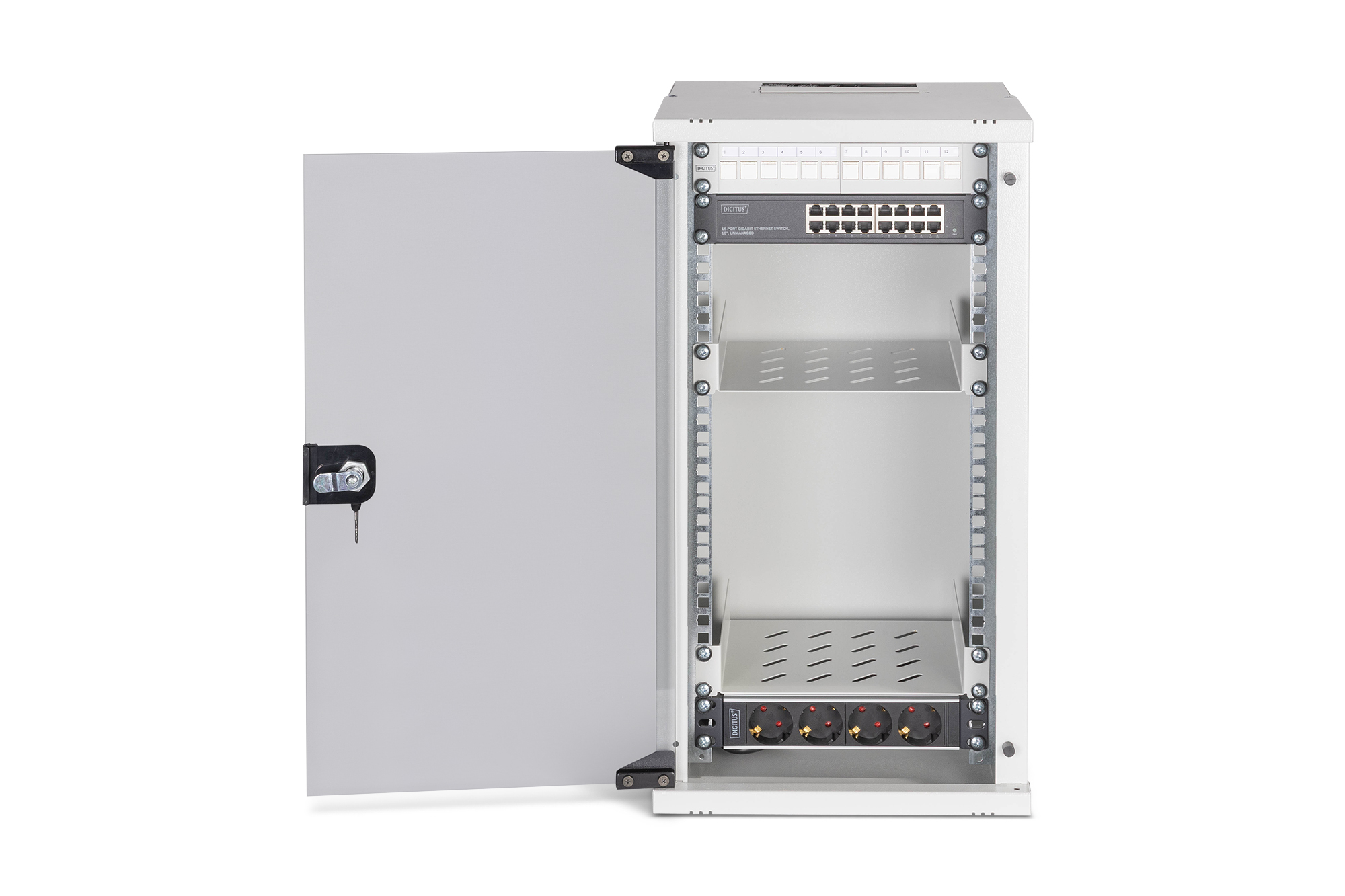 Digitus DN-49104-SET, Wandrek, 12U, 60 kg, Sleutelsleuf, Rekrails, Verbeterd kabelbeheer