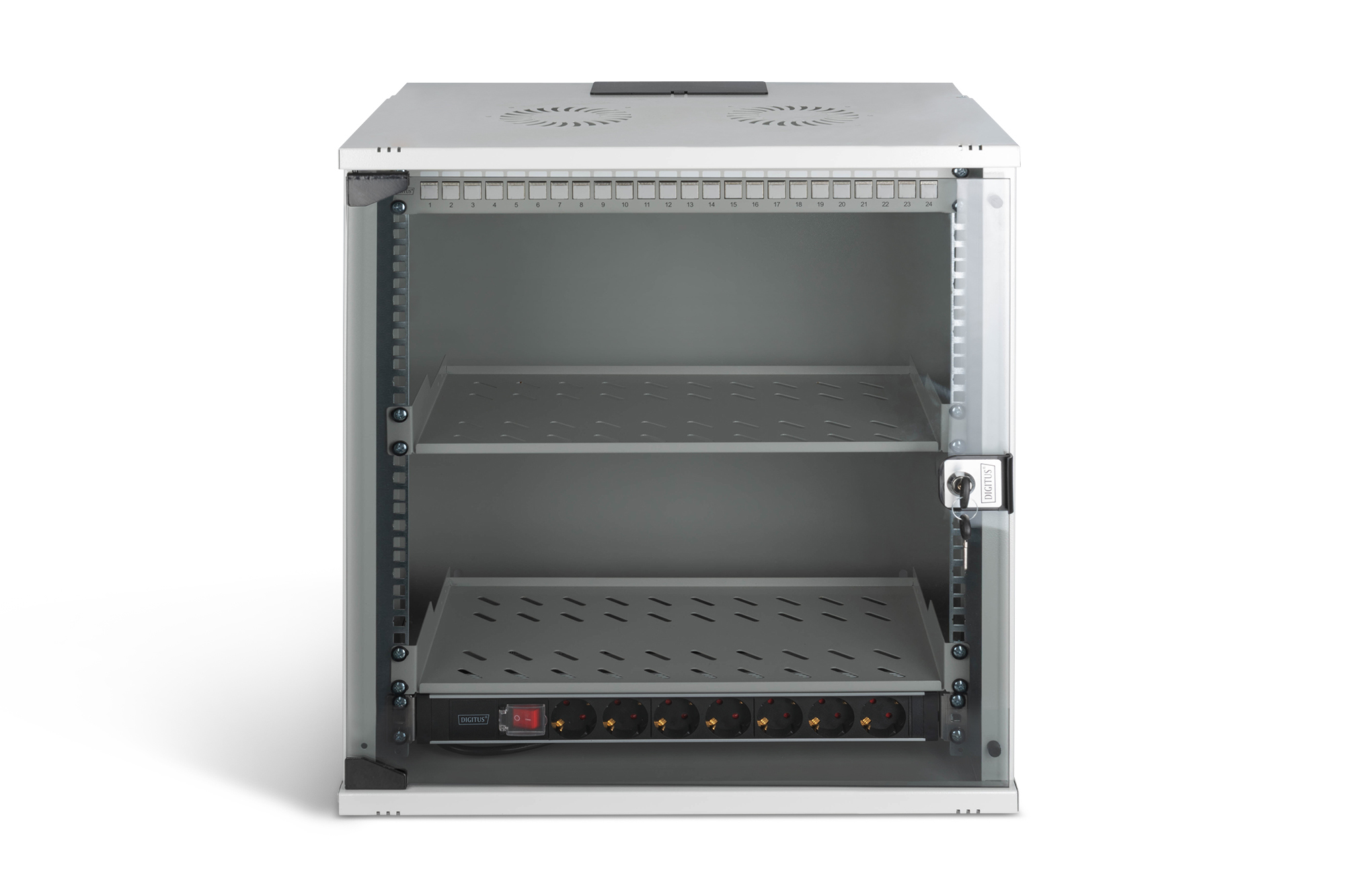 Digitus DN-49206-SET, Wandrek, 12U, 60 kg, Sleutelsleuf, Rekrails, Verbeterd kabelbeheer