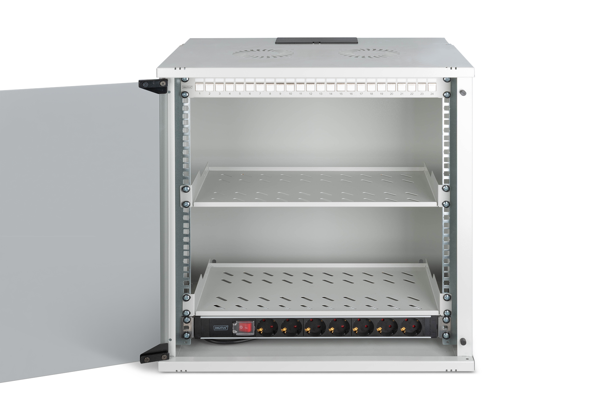 Digitus DN-49206-SET. Soort: Wandrek, Rackcapaciteit: 12U, Maximale gewichtscapaciteit: 60 kg, Sleutelsleuf, Verbeterd kabelbeheer, Rekrails, Internationale veiligheidscode (IP): IP20. Gewicht: 16,3 kg. Kleur van het product: Grijs