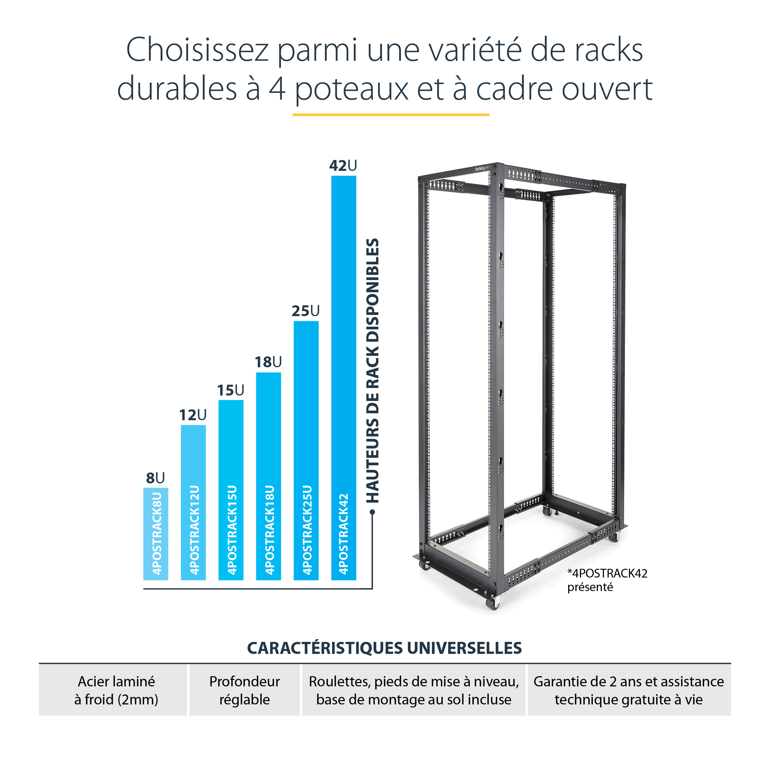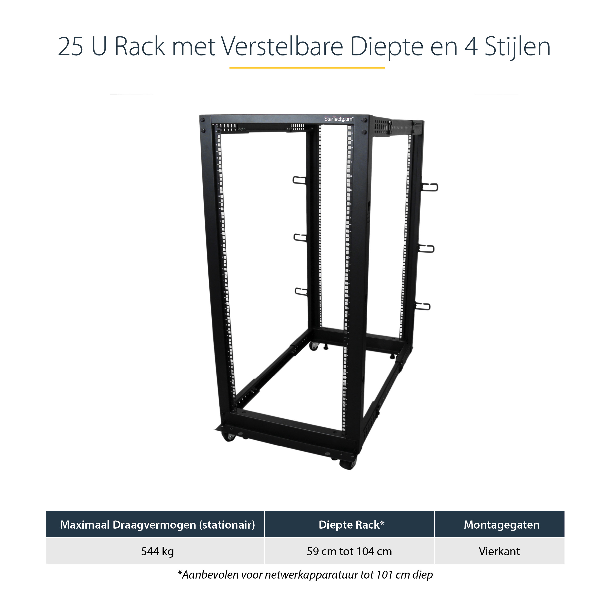 StarTech.com 25U 4-Post Server Rack, 19in Open Frame Rack met 101cm Montagediepte en 544kg Draagkracht, Mobiel of Vrijstaand IT Rack, Vrijstaande rek, 25U, 544,3 kg, Verbeterd kabelbeheer, Zwenkwieltjes, 33 kg