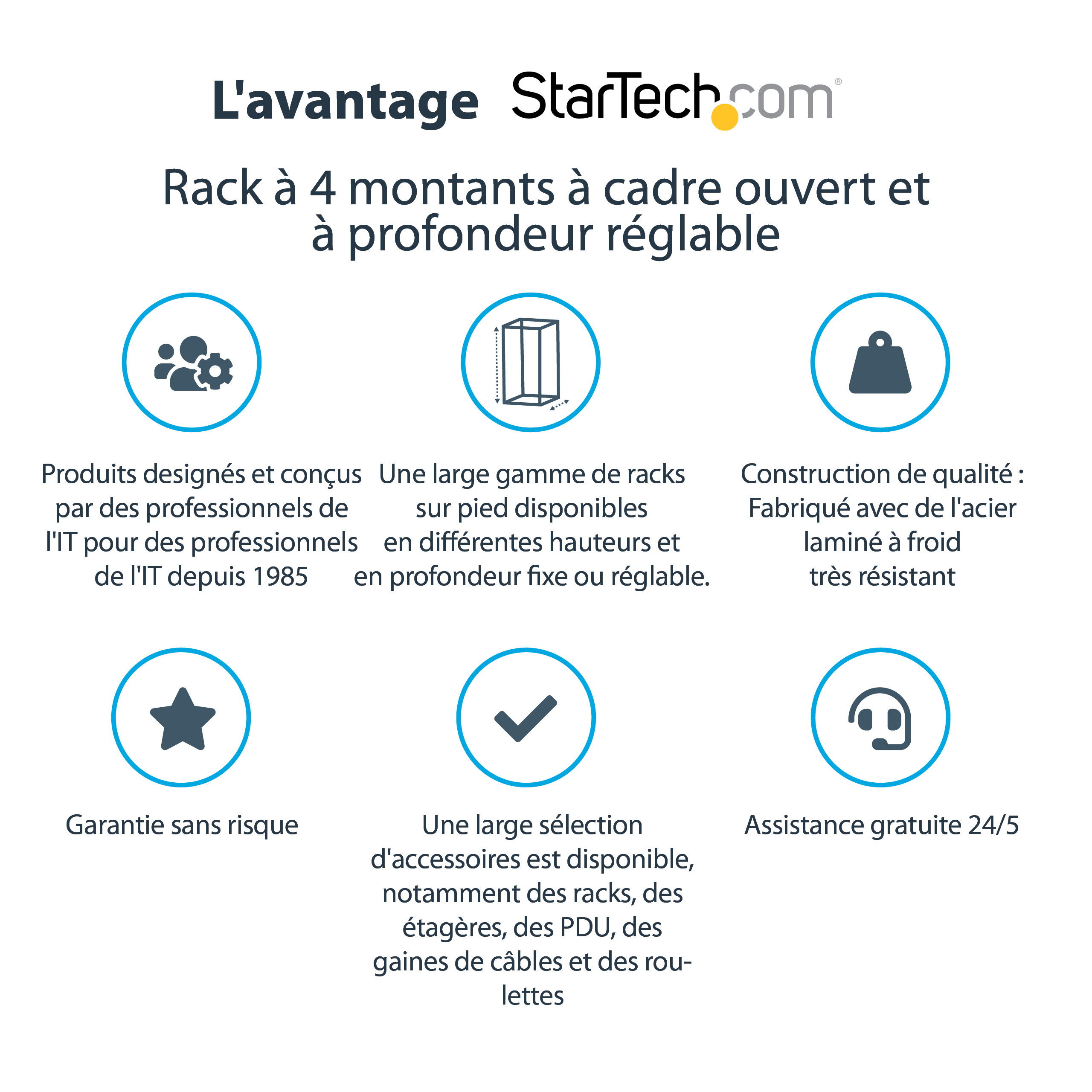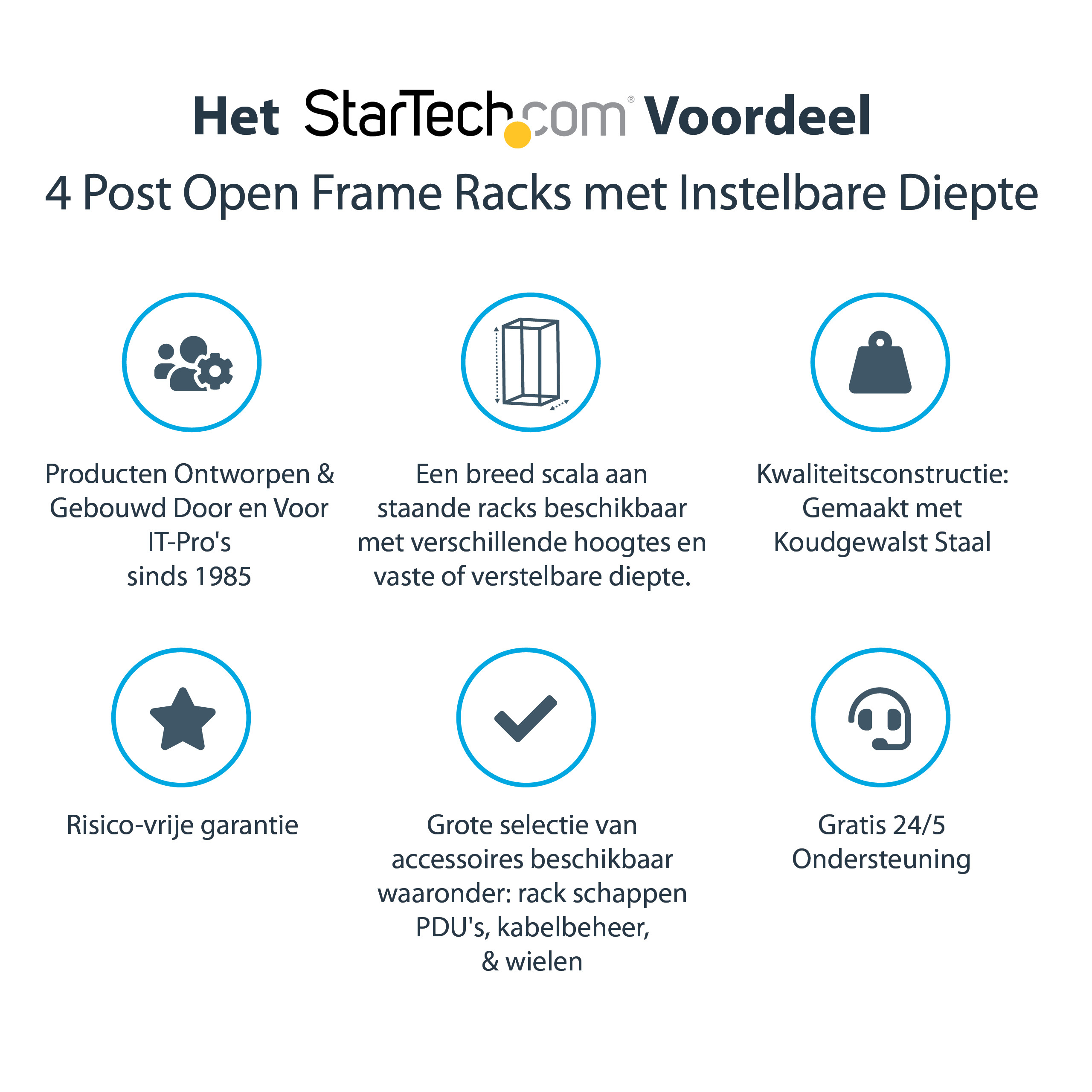 Dit duurzame rack met 4 stijlen heeft een maximale statische belastbaarheid van 544 kg en voldoet aan diverse industriële rackstandaards (EIA/ECA-310, IEC 60297, DIN 41494) voor een universeel design dat geschikt is voor de meeste rackapparatuur.