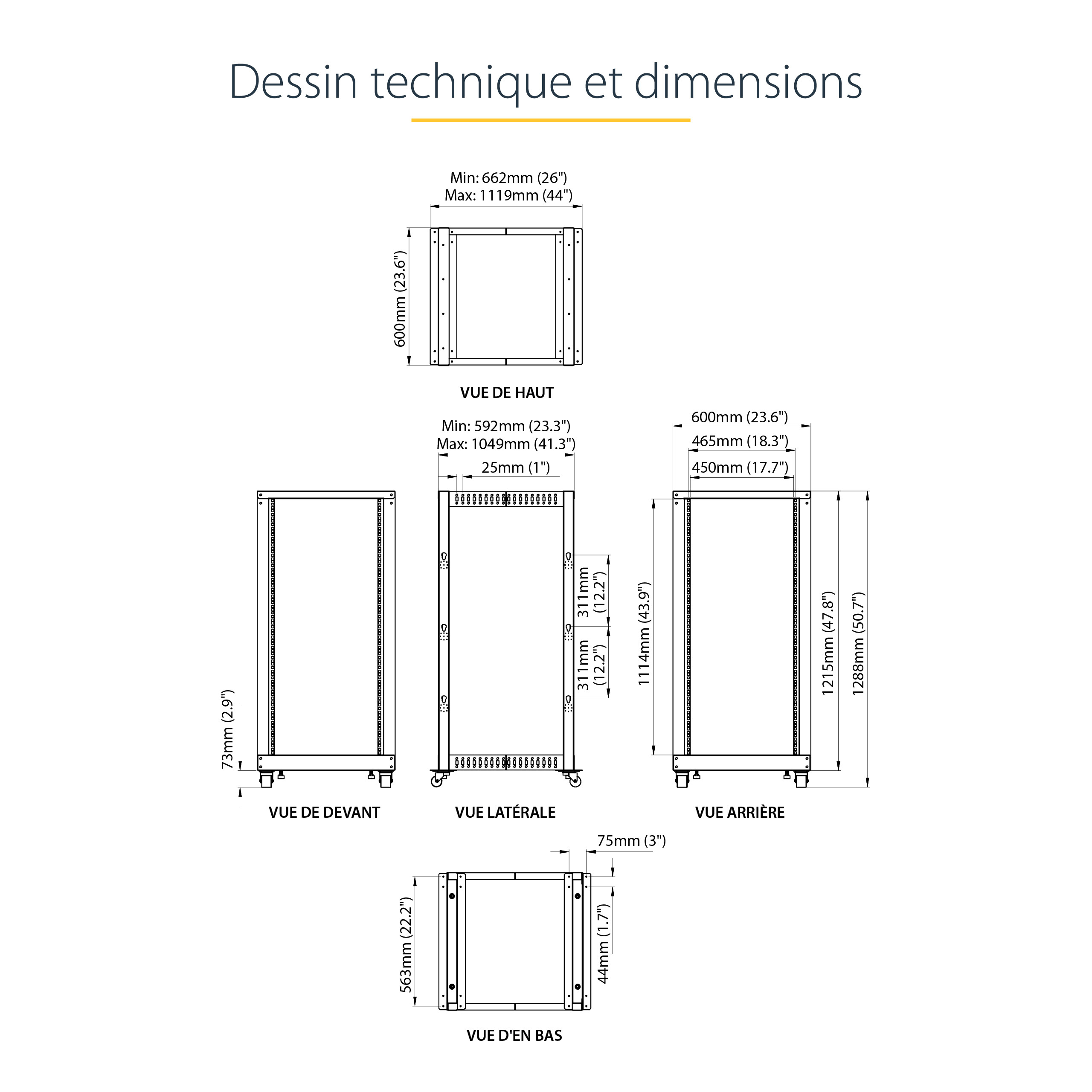 Ontworpen voor gebruiksgemak biedt dit 25U rack gemakkelijk leesbare markeringen voor beide rackeenheden (U) en diepte, met vele diepte-instellingen (van 56,0 tot 101,7 cm (22 tot 40")) waardoor het rack gemakkelijk aan uw apparatuur kan worden aangepast.