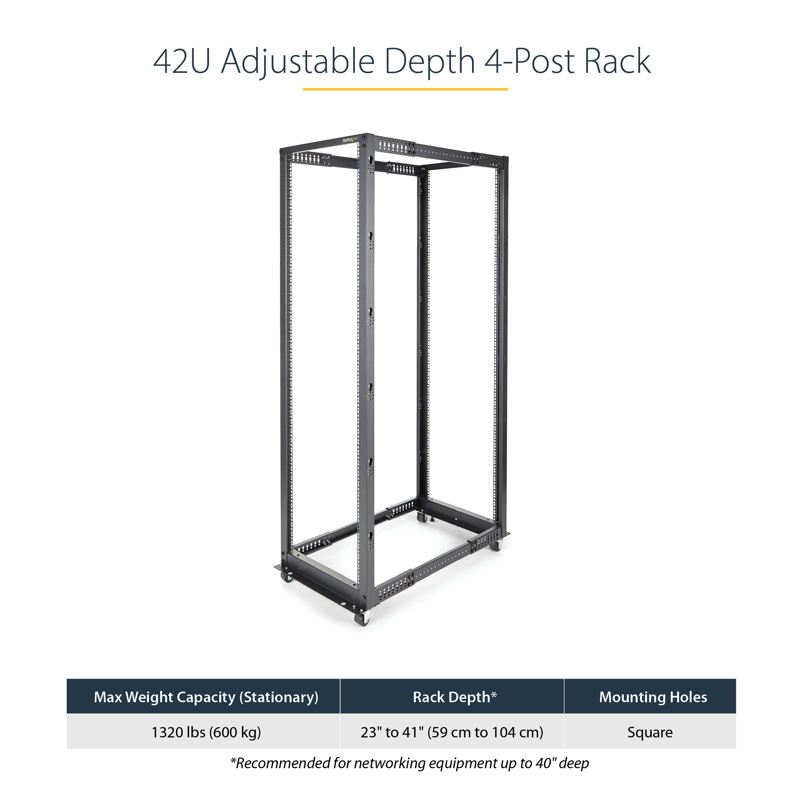 StarTech.com 4-Post 42U Mobiel Open Frame Server Rack, 19" Patchkast met Wielen en 4 Stijlen, Open Serverkast met Verstelbare Diepte voor Computer / AV / Netwerk Apparatuur - Wielen, Stelvoeten of Vloermontage, Vrijstaande rek, 42U, 600 kg, Verbeterd kabe