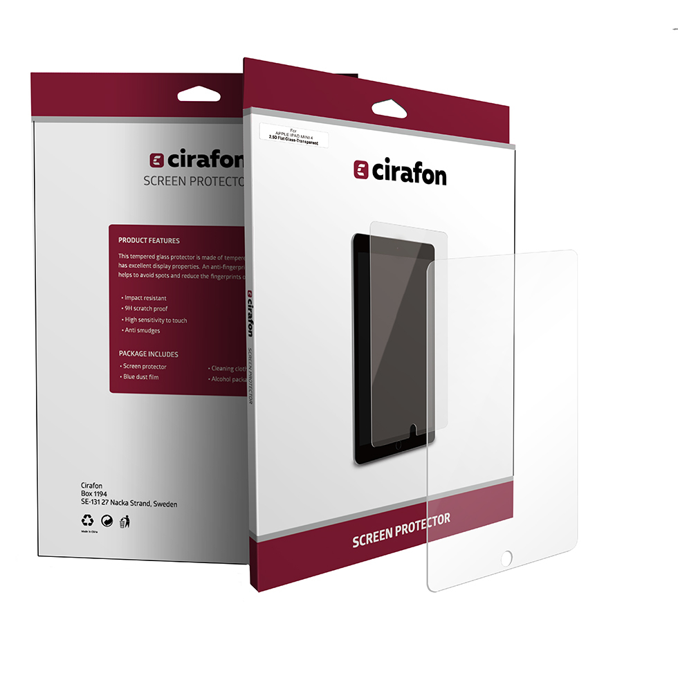 Cirafon Ultra-Wide Glas Plus 7,9". Type schermbeschermer: Doorzichtige schermbeschermer, Maximale schermgrootte: 20,1 cm (7.9"), Oppervlakteafwerking: Glanzend, Materiaal: Gehard glas, Merkcompatibiliteit: Apple, Compatibiliteit: iPad Mini, iPad Mini 4. Aantal per verpakking: 1 stuk(s)