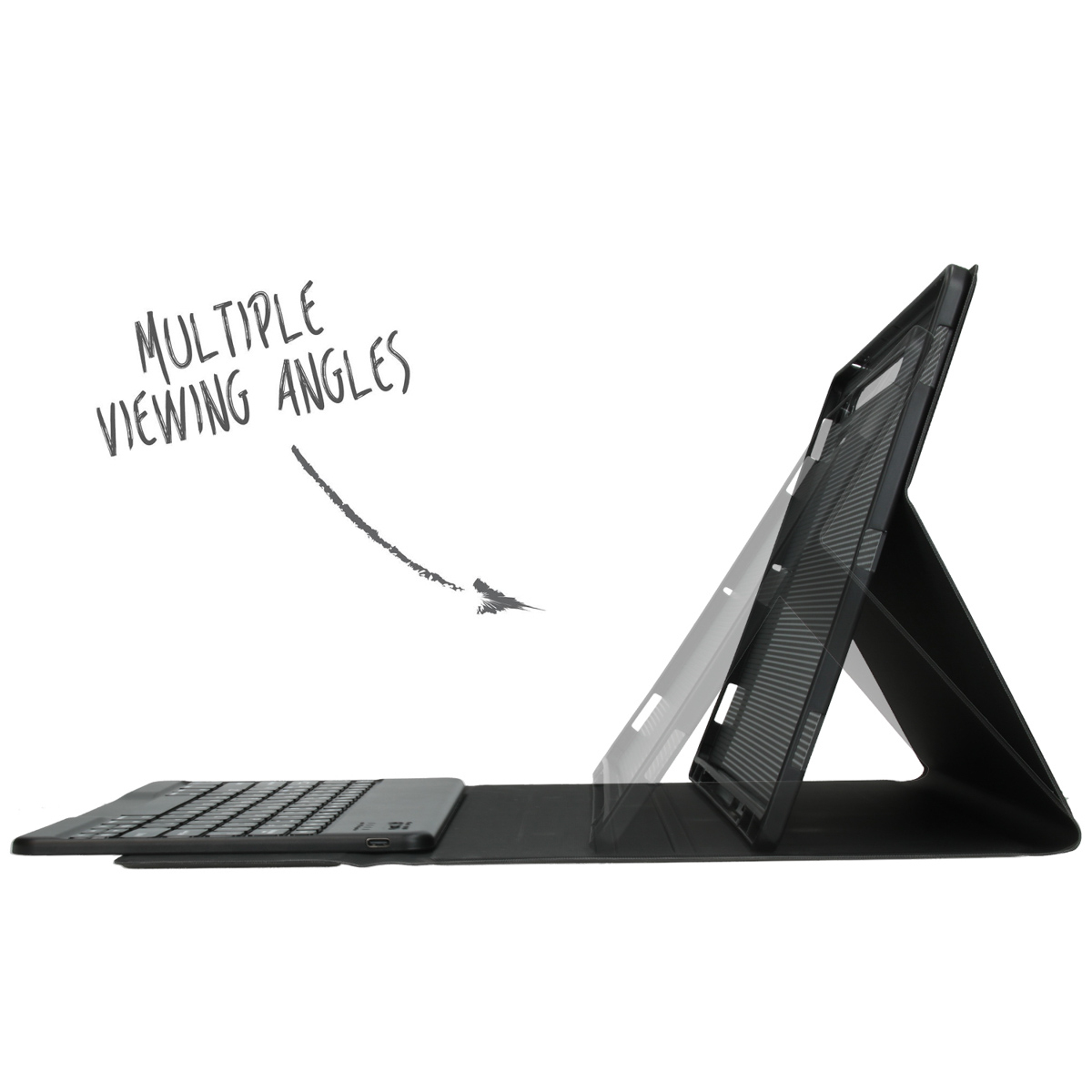 Dit betekent dat je geen lastige kabels meer hoeft mee te slepen, waardoor je meer bewegingsvrijheid hebt. De bookcase wordt geleverd met een handige USB-C kabel om de batterij op te laden, zodat je altijd klaar bent voor actie. Magnetisch toetsenbord en slank design Het toetsenbord is magnetisch bevestigd aan de hoes, waardoor je deze gemakkelijk kunt plaatsen en verwijderen.