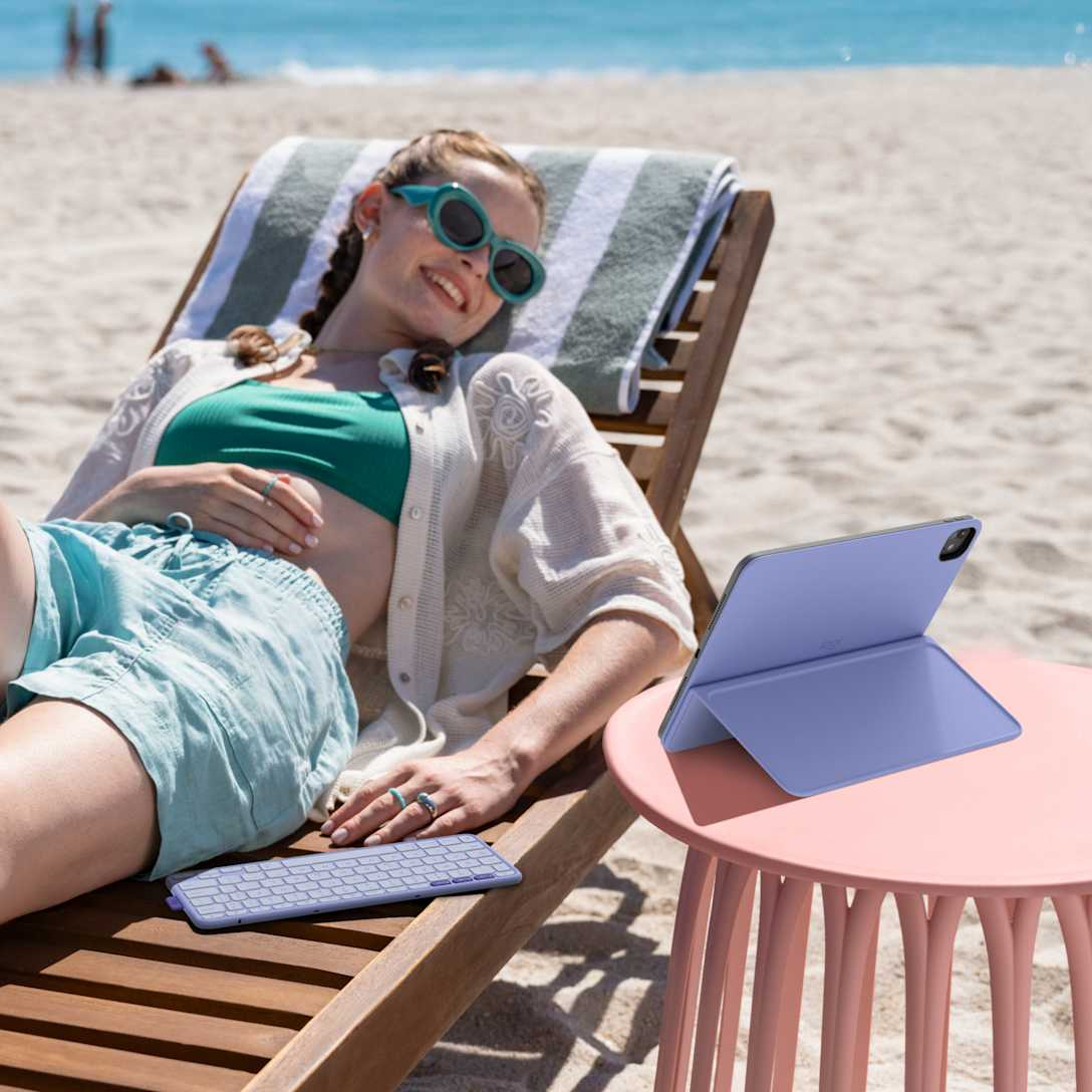 Logitech Flip Folio. Toetsenbordindeling: QWERTZ, Taal toetsenbord: Duits, Tussenafstand toetsen (vanaf het midden gemeten): 1,8 cm. Merkcompatibiliteit: Apple, Compatibiliteit: iPad Pro 11-inch (M4), iPad Air 11-inch (M2 & M3), iPad Air (5th gen), Kleur van het product: Lila. Connectiviteitstechnologie: Draadloos, Aansluiting: Bluetooth. Stroombron: Batterij/Accu, Capaciteit van de accu/batterij: 90 mAh, Levensduur batterij: 2 jaar. Breedte: 109 mm, Diepte: 7 mm, Hoogte: 256 mm