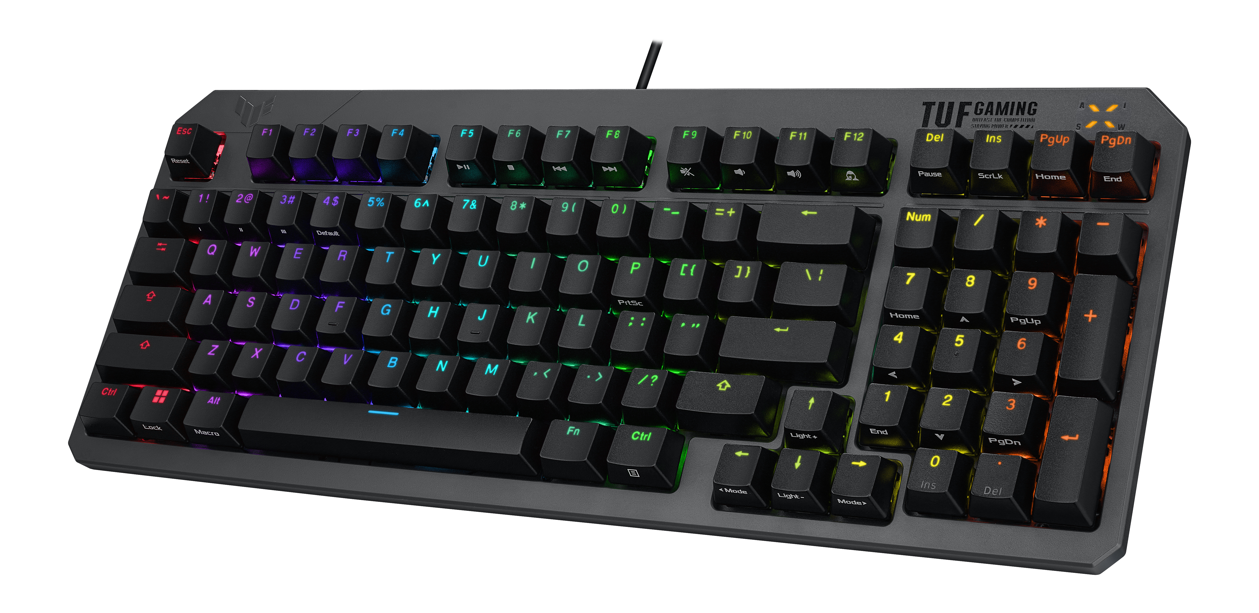 ASUS TUF Gaming K3 Gen II. Toetsenbord formaat: Volledige grootte (100%). Stijl toetsenbord: Recht. Connectiviteitstechnologie: Bedraad, Aansluiting: USB, Toetsenbord toetsschakelaar: Opto-mechanische toetsschakelaar. Backlight type: RGB LED. Snoerlengte: 2 m. Aanbevolen gebruik: Gamen. Kleur van het product: Zwart