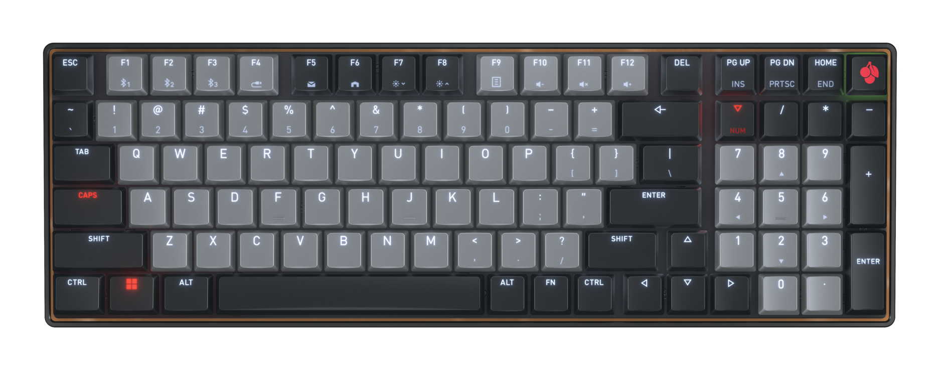 CHERRY KW 550 MX LP. Toetsenbord formaat: 96%. Stijl toetsenbord: Recht. Connectiviteitstechnologie: Bedraad en draadloos, Aansluiting: USB + Bluetooth, Toetsenbord toetsschakelaar: Mechanische keyswitch, Toetsenbordindeling: QZERTY. Backlight type: LED. Snoerlengte: 1,8 m. Aanbevolen gebruik: Thuis/Werk. Kleur van het product: Zwart