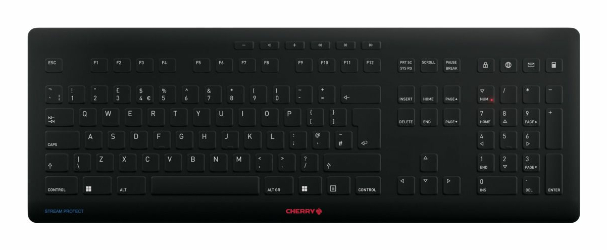 CHERRY STREAM PROTECT WIRELESS, Volledige grootte (100%), Draadloos, RF Draadloos, Schaar-toetsschakelaar, QWERTY, Zwart