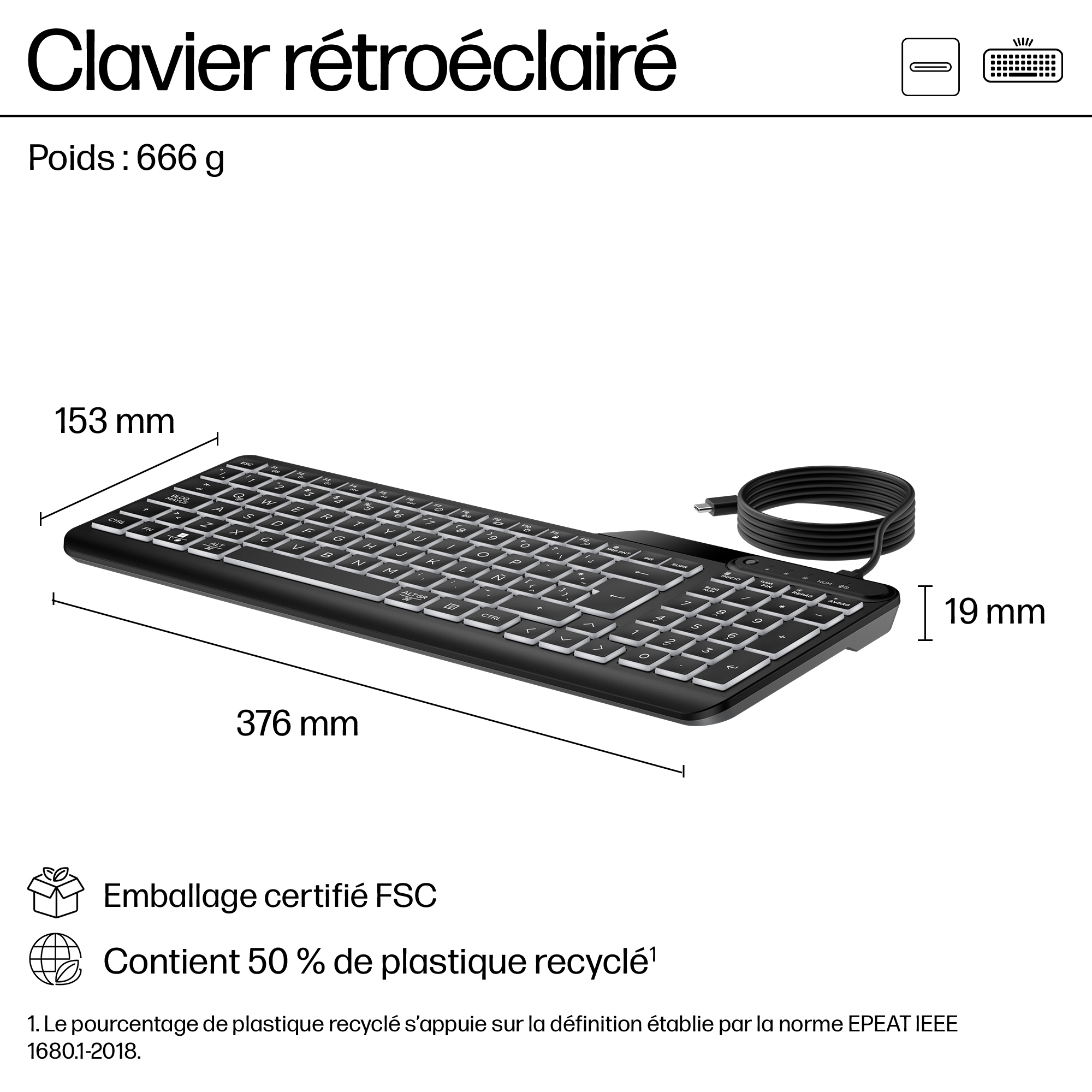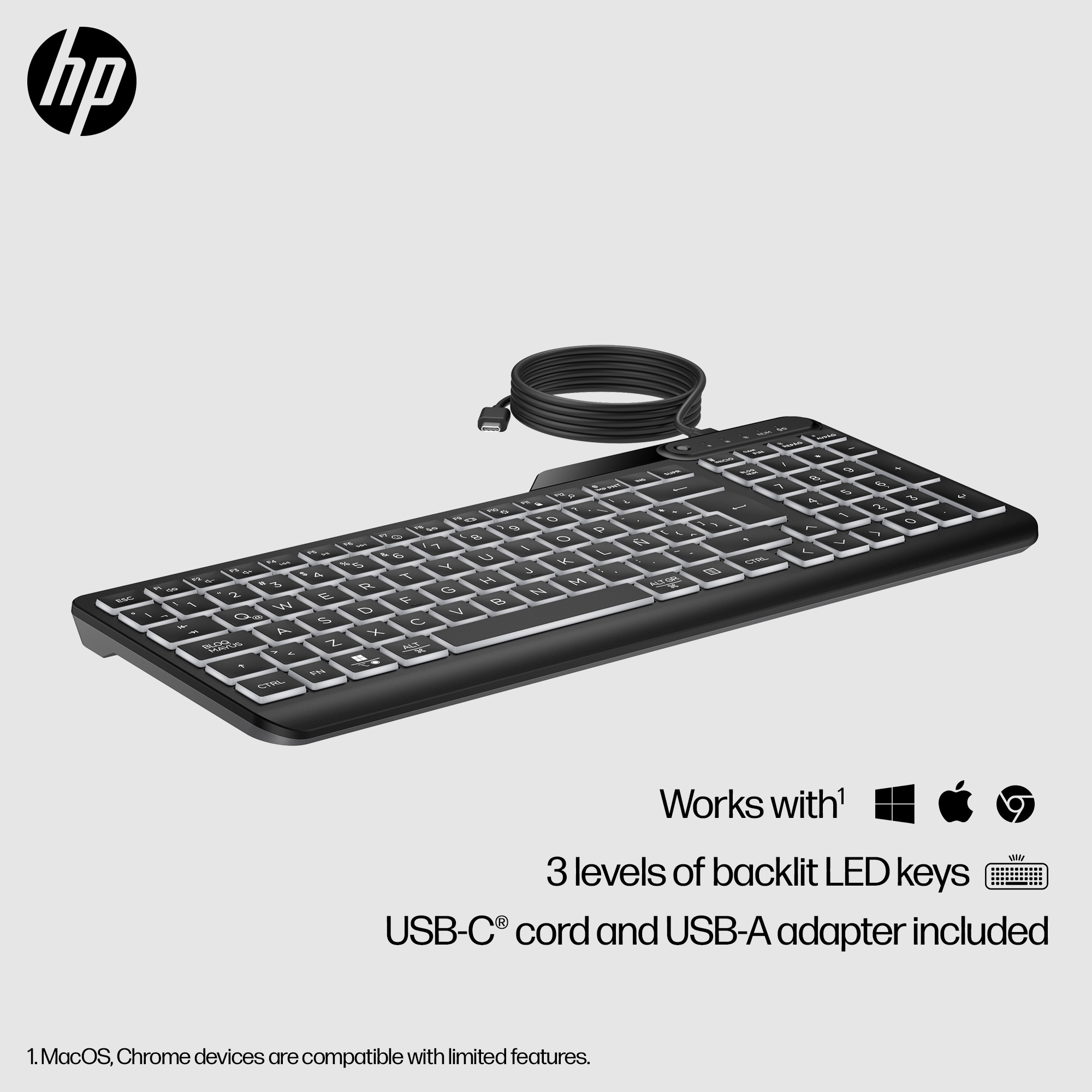 Met de warmwitte, verlichte toetsen kun je met dit gebruiksklare toetsenbord gewoon door blijven werken. Sluit het aan op je apparaat en ga aan het werk met stille toetsen en 3 niveaus backlit LED-gloed. En met 12 programmeerbare toetsen kun je nog productiever werken. Werk en ontspan de hele dag door op het dunne en reinigbare[1] HP 400 Backlit Wired-toetsenbord.