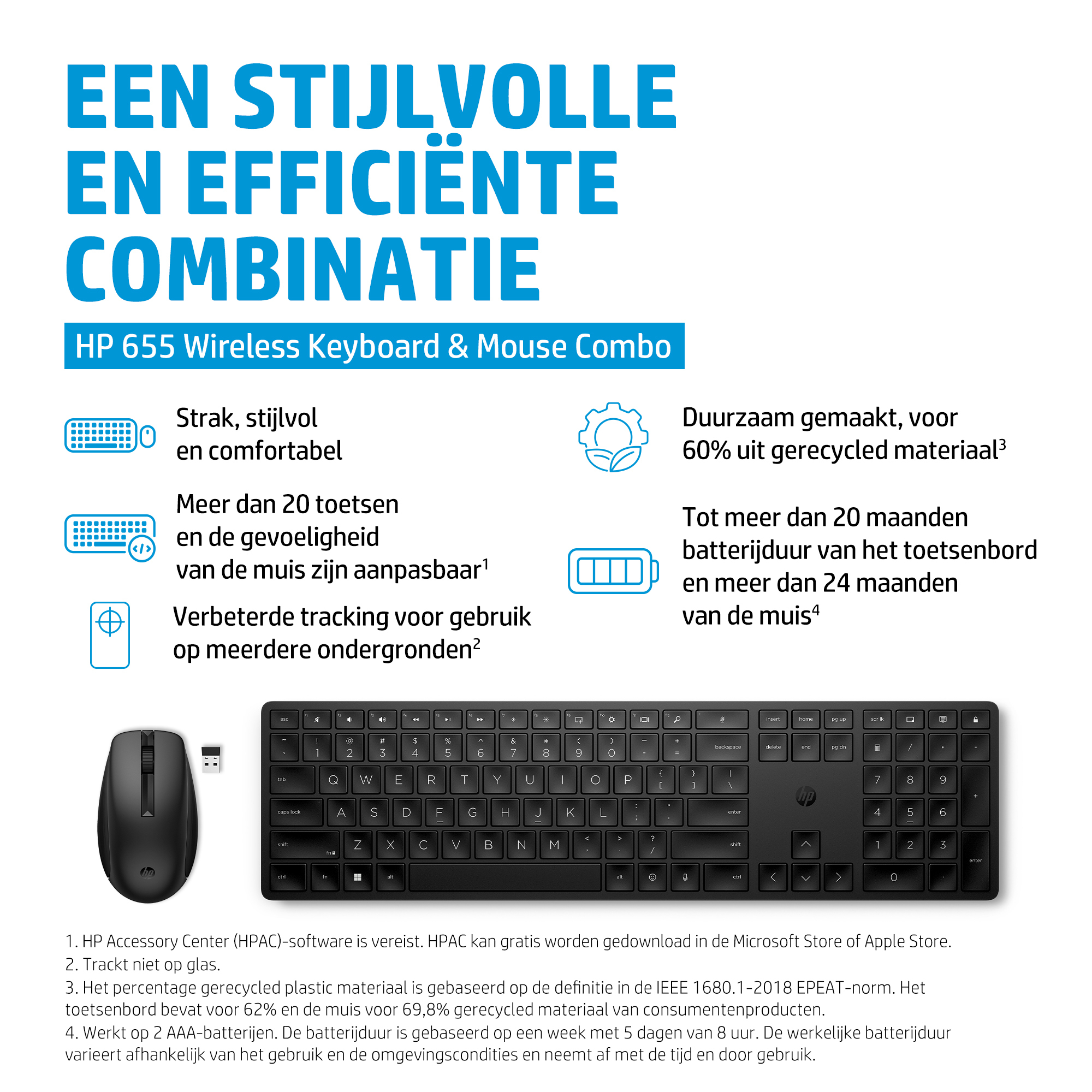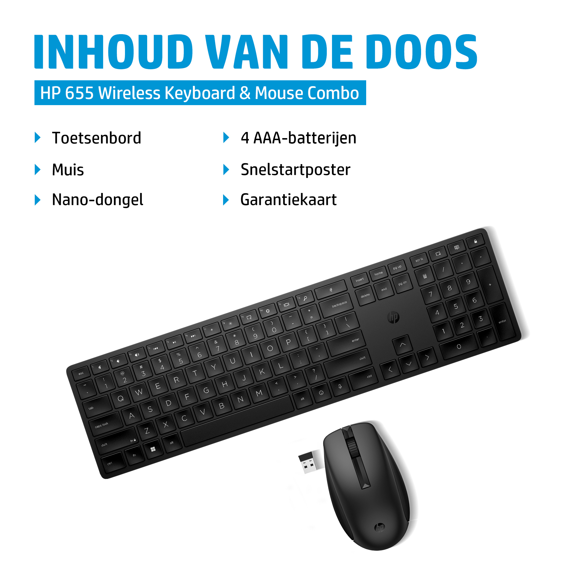 HP 655 draadloze toetsenbord- en muiscombinatie (zwart 10), Draadloos, RF Draadloos, Mechanische keyswitch, QWERTY, Zwart, Inclusief muis
