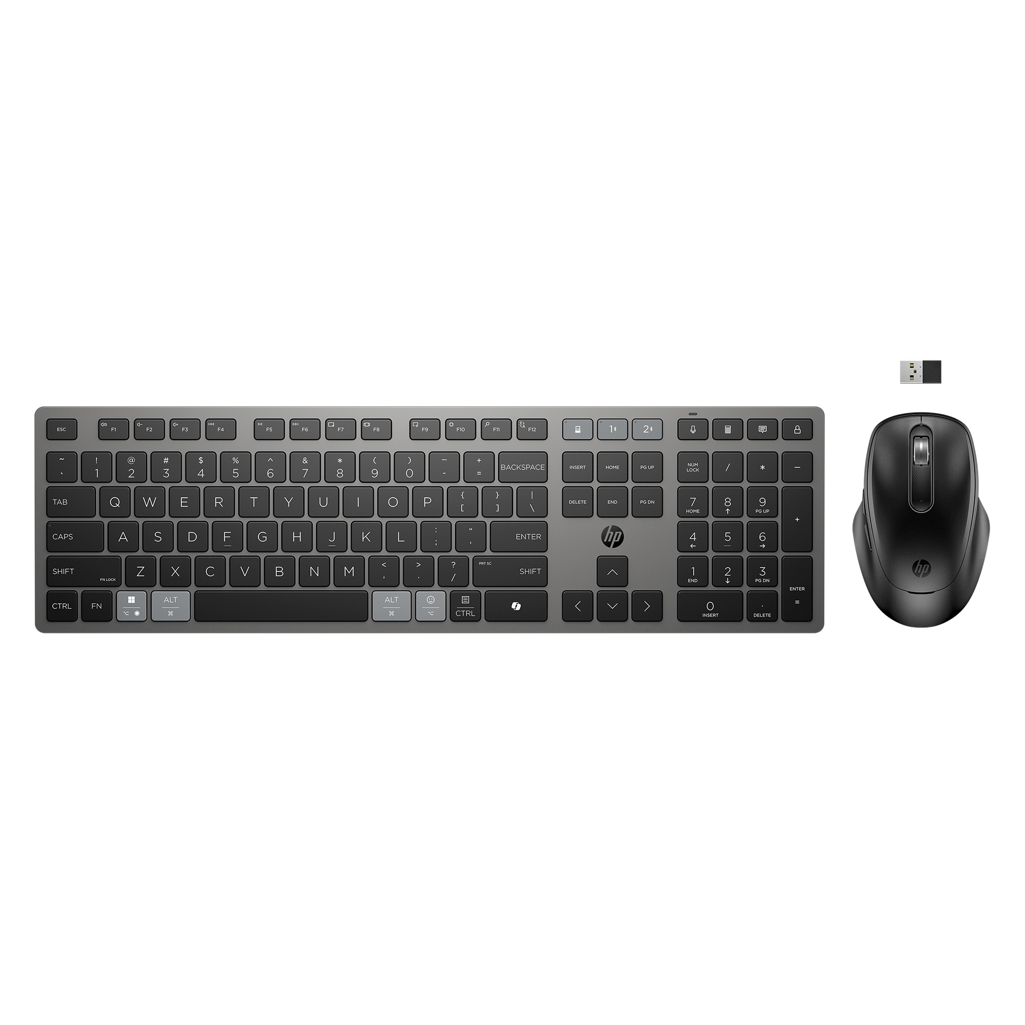 HP 725 Multi-Device Rechargeable Wireless Keyboard and Mouse Combo, Volledige grootte (100%), Draadloos, RF-draadloos + Bluetooth, Schaar-toetsschakelaar, Zwart, Inclusief muis