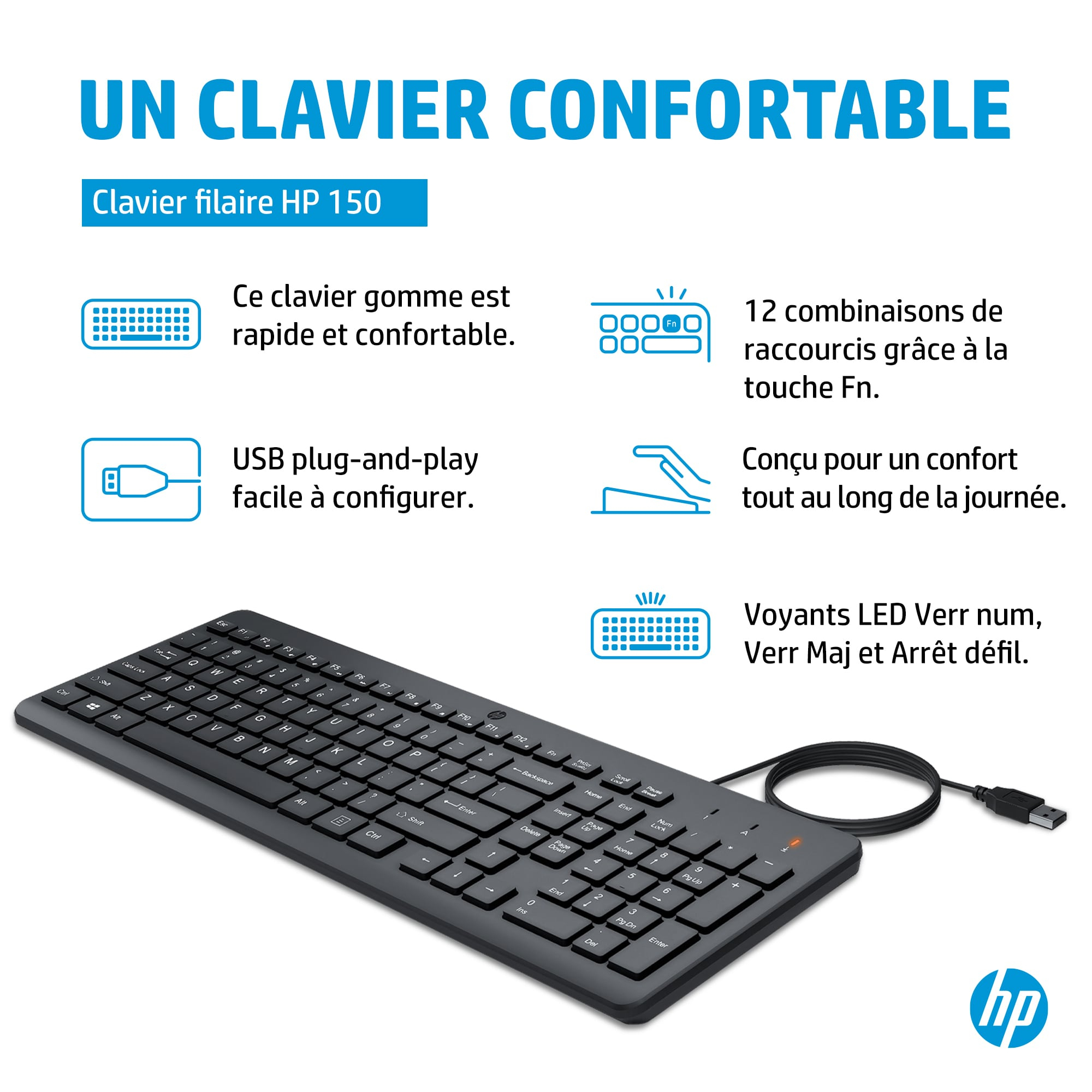 HP 150 Wired Keyboard, Volledige grootte (100%), Bedraad, USB, Mechanische keyswitch, QWERTY, Zwart