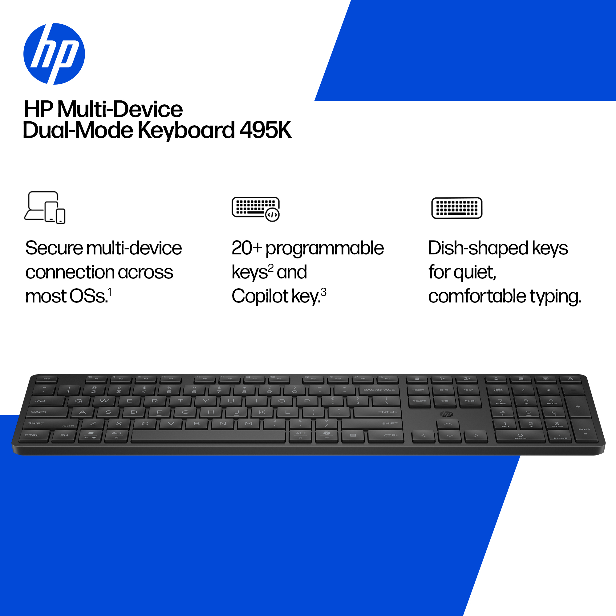 HP 495K dual-mode toetsenbord voor meerdere apparaten, Volledige grootte (100%), Draadloos, USB + Bluetooth, Zwart
