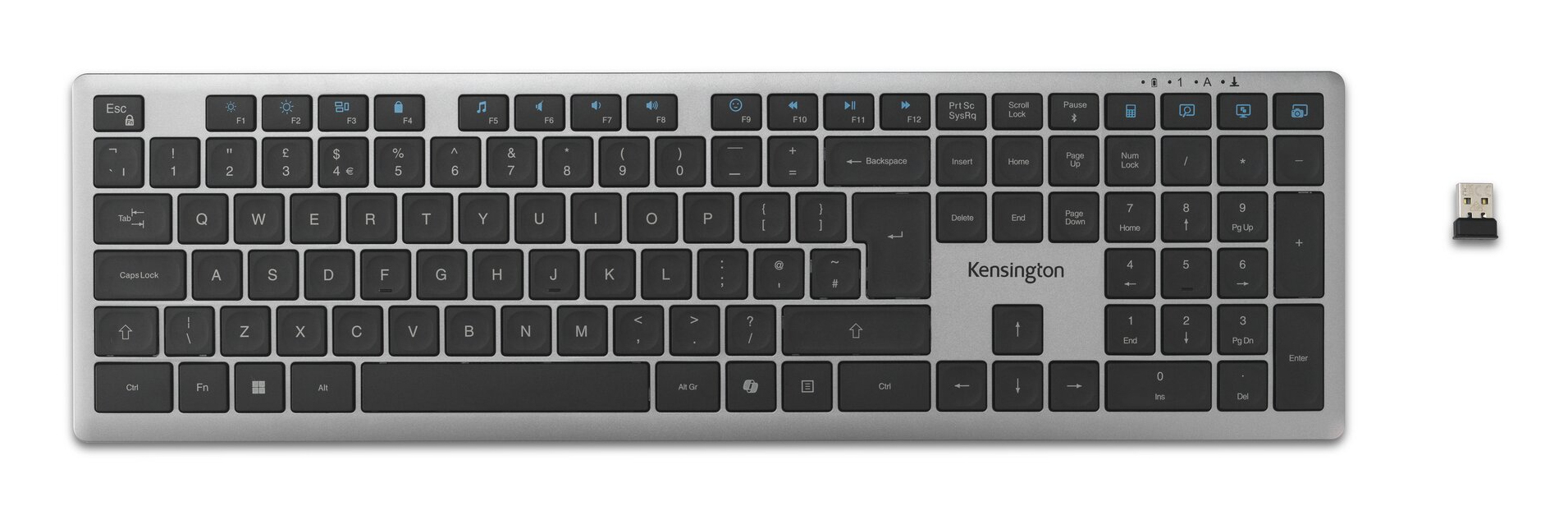Kensington K75408UK. Toetsenbord formaat: Volledige grootte (100%). Stijl toetsenbord: Recht. Connectiviteitstechnologie: Draadloos, Aansluiting: RF-draadloos + Bluetooth, Toetsenbord toetsschakelaar: Schaar-toetsschakelaar, Toetsenbordindeling: QWERTY, Aantal toetsen, toetsenbord: 110, Aanbevolen gebruik: Thuis/Werk. Kleur van het product: Grijs