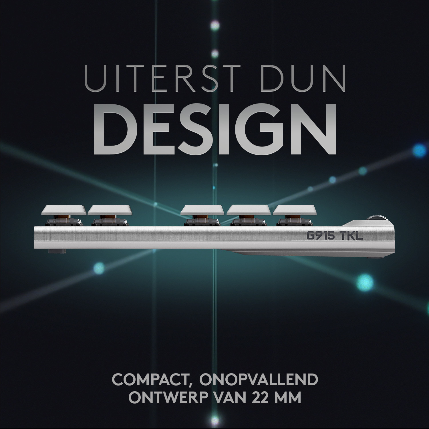 De G915 TKL is gemaakt van eersteklas materialen en combineert een elegante look met superieure kwaliteit. De bovenkant van 5052-aluminiumlegering zit aan een met staal versterkte basis, voor een licht, uiterst dun maar toch sterk en duurzaam design.
