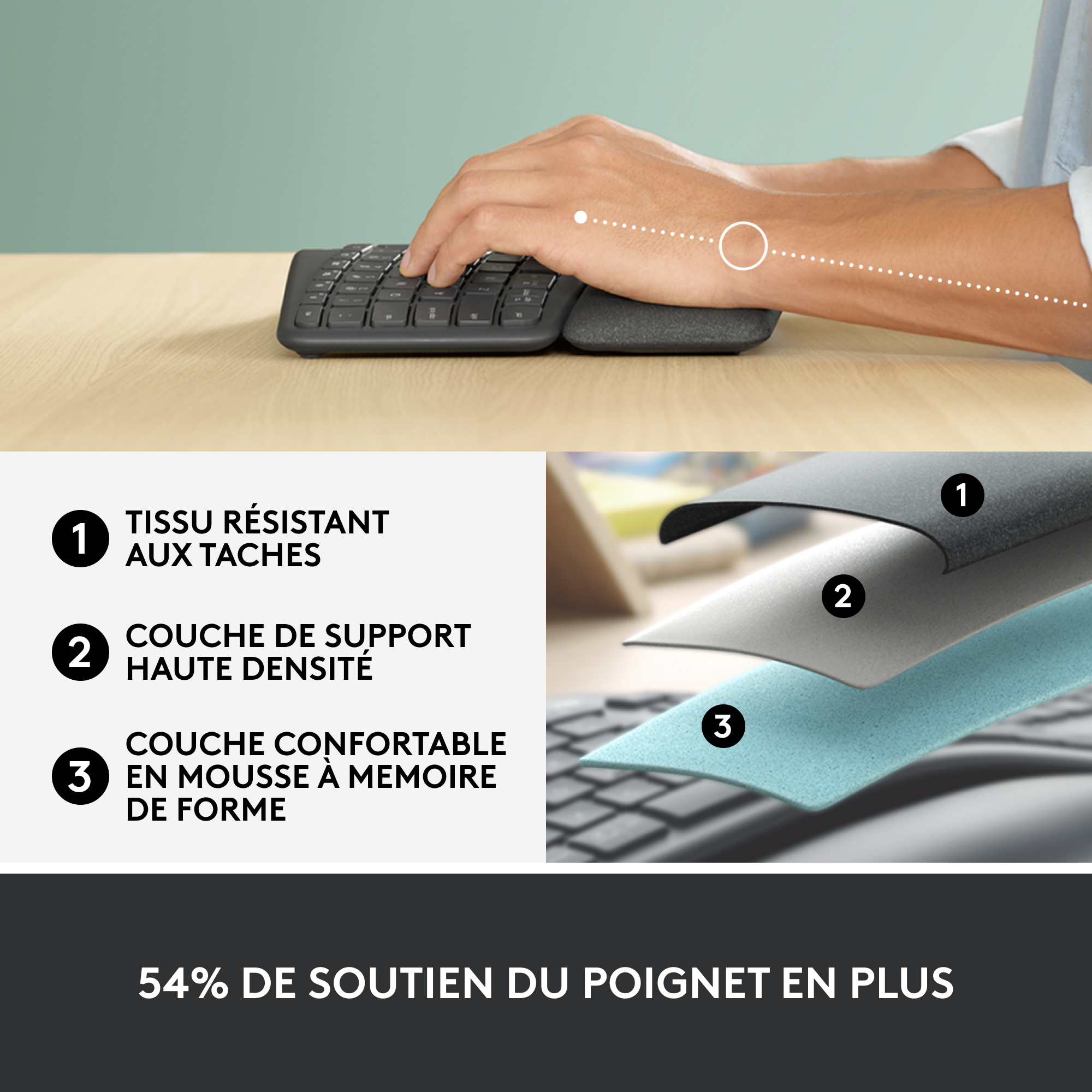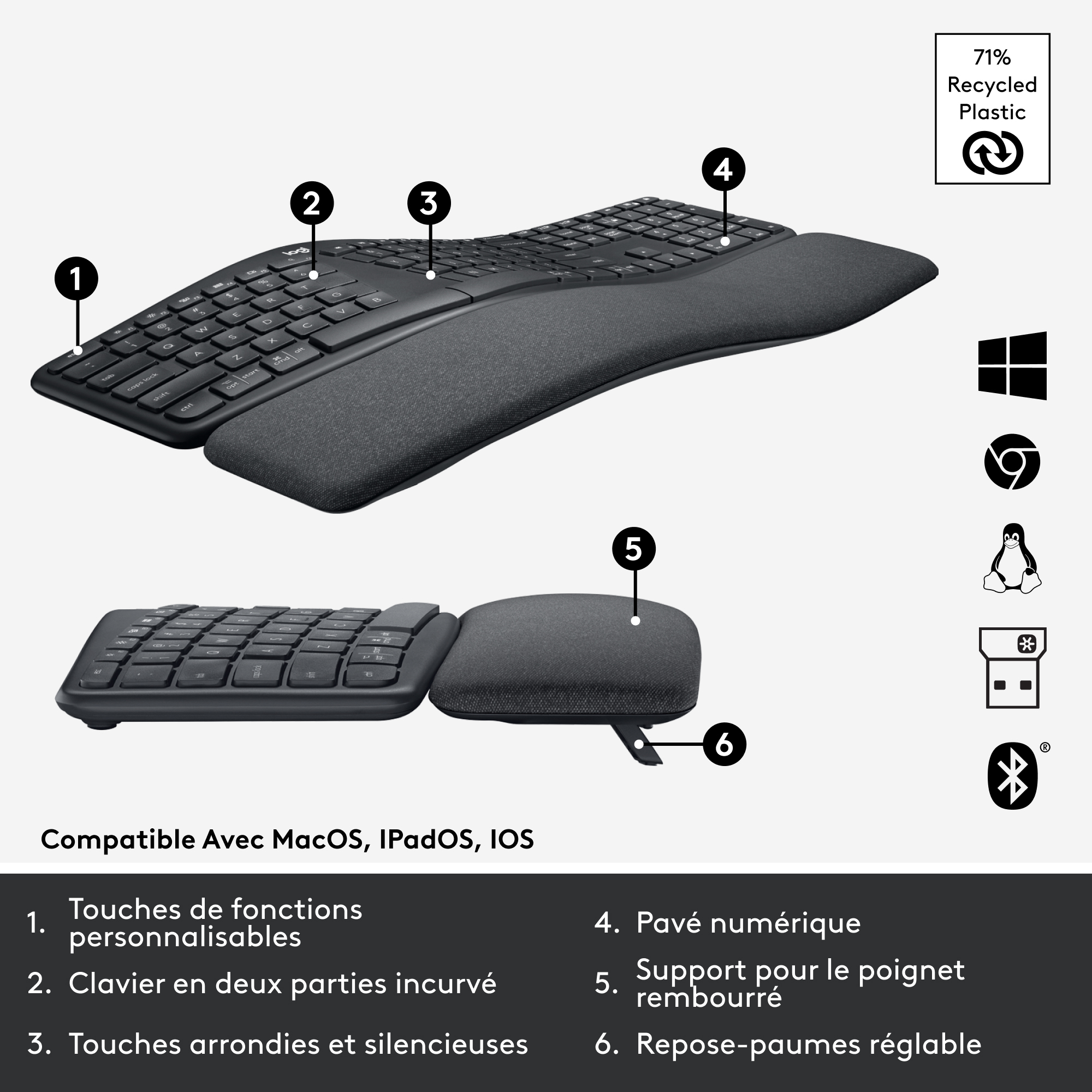 Logitech ERGO K860, Volledige grootte (100%), Draadloos, RF-draadloos + Bluetooth, Semi-mechanische sleutelschakelaar, AZERTY, Grafiet