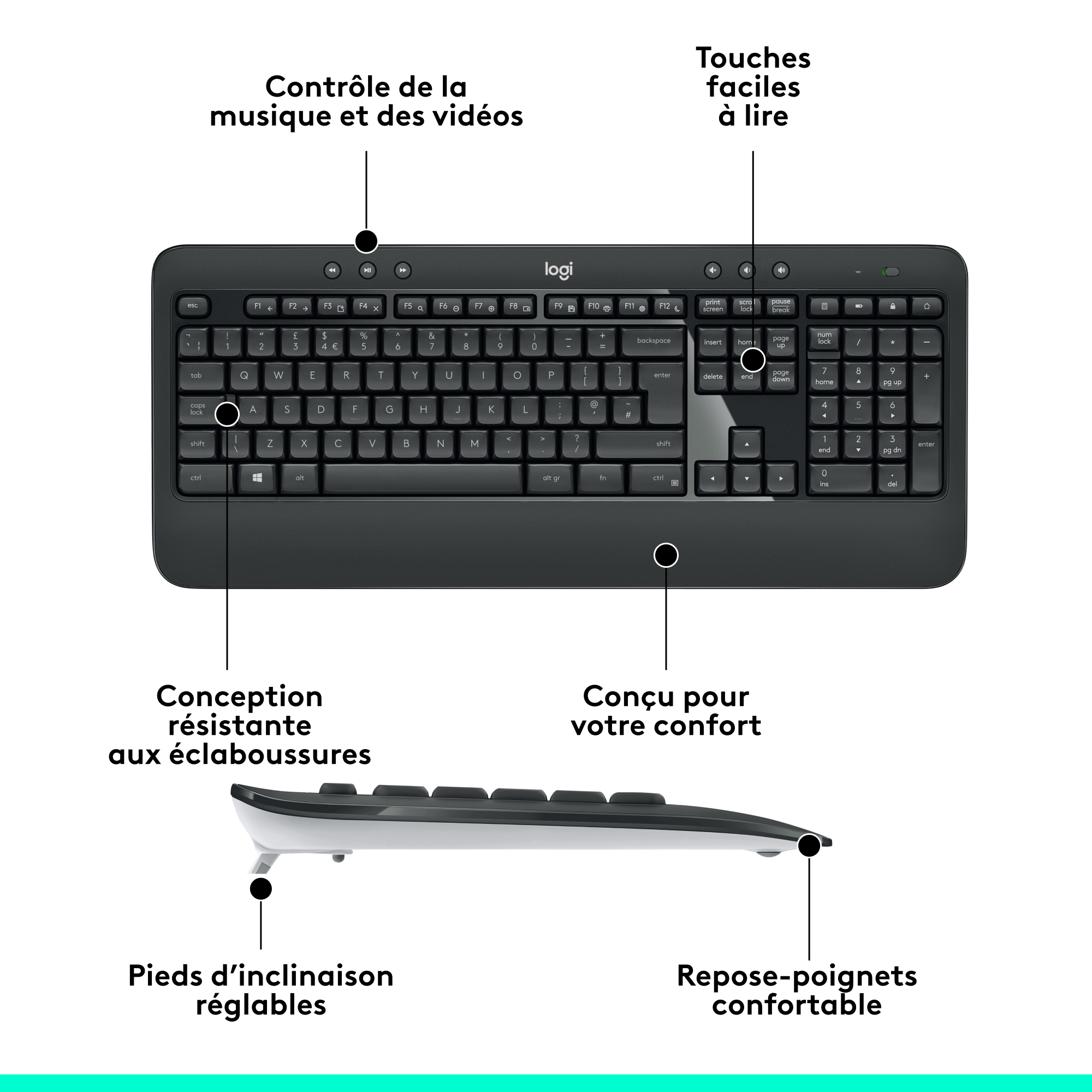 Logitech MK540 Advanced. Toetsenbord formaat: Standaard. Stijl toetsenbord: Recht. Connectiviteitstechnologie: Draadloos, Aansluiting: RF Wireless, Toetsenbord toetsschakelaar: Membraan keyswitch, Toetsenbordindeling: FRANS AZERTY. Polssteun. Aanbevolen gebruik: Universeel. Kleur van het product: Black, Wit. Inclusief muis
