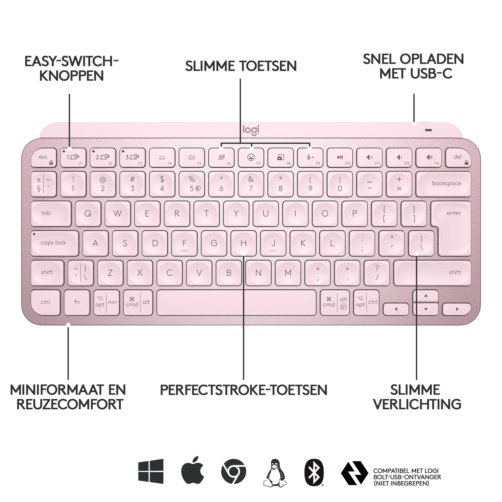 Logitech MX Keys Mini, Mini, Draadloos, RF-draadloos + Bluetooth, AZERTY, LED, Roze