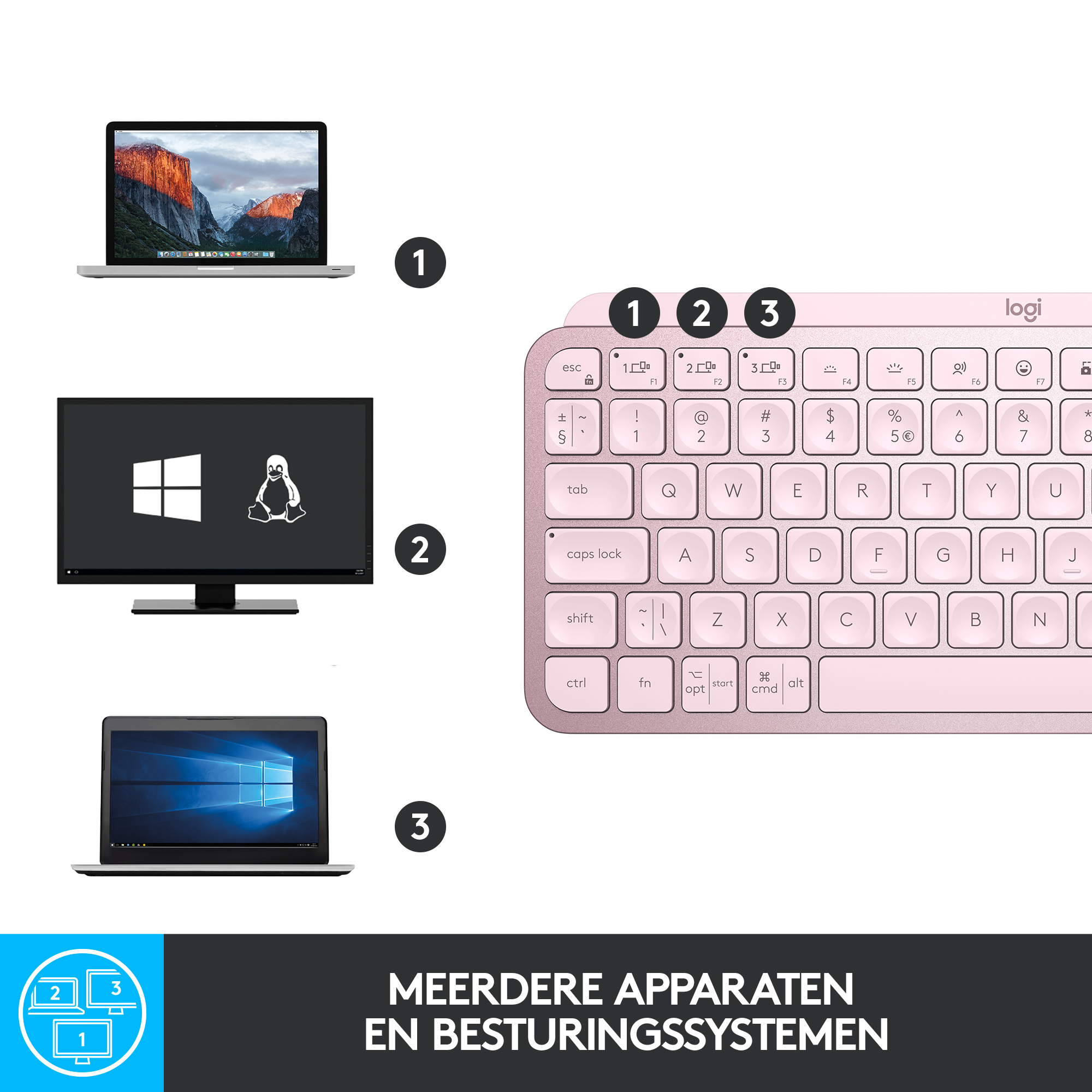 Koppel het MX Keys Mini compact toetsenbord met maximaal 3 apparaten op bijna elk besturingssysteem via Bluetooth Low Energy en schakel naadloos tussen de apparaten