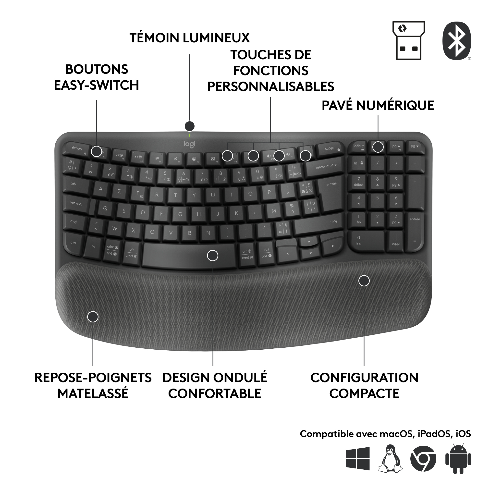 Logitech Wave Keys for Business Ergonomisch Toetsenbord, Volledige grootte (100%), RF-draadloos + Bluetooth, Membraan keyswitch, FR AZERTY, Grafiet