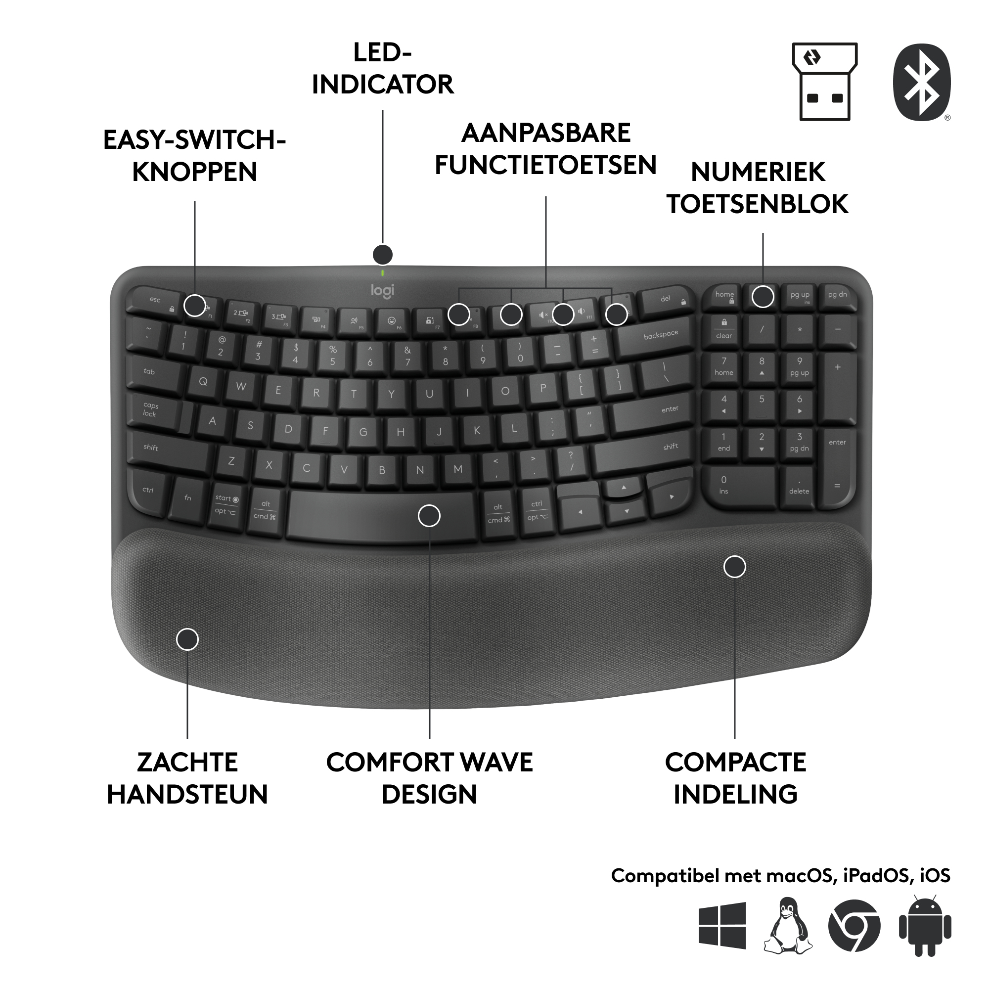 De Wave Keys for Business is ontworpen door de marktleider in ergonomische toetsenborden en muizen en heeft een golvend ontwerp en een gewatteerde handsteun die 57% betere ondersteuning van de pols biedt. Grote, geronde toetsen en een kortere toetsafstand maken typen vloeiend en gemakkelijk.