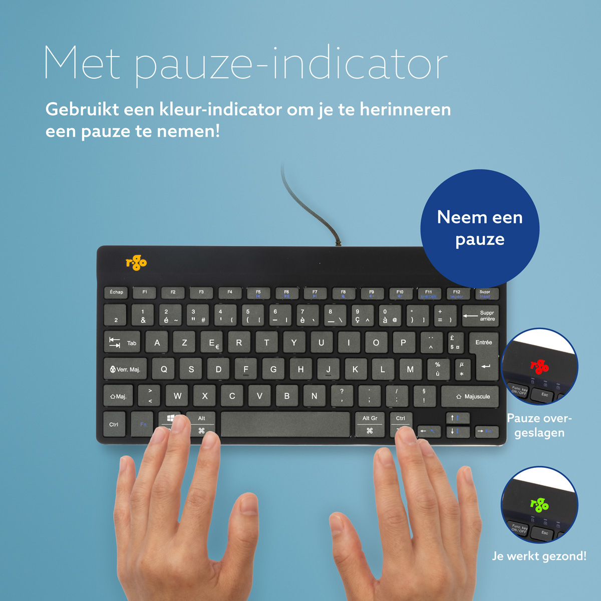 Dit compacte toetsenbord beschikt over alle ergonomische kenmerken om gezond te kunnen typen. Het compacte design zorgt ervoor dat je handen bij gelijktijdig gebruik van toetsenbord en muis altijd binnen schouderbreedte blijven. De lichte toetsaanslag vermindert de spierspanning tijdens het typen. Het toetsenbord is ultradun, zodat je handen en polsen tijdens het typen in een ontspannen, natuurlijke stand staan. Dit zorgt voor een betere doorbloeding van je handen. Het R-Go Compact Break toetsenbord geeft met LED- kleursignalen aan wanneer het tijd is om te pauzeren. Tijdens het typen verandert het lampje van kleur, zoals een stoplicht. Als het lampje groen oplicht, betekent het dat je gezond werkt. Oranje geeft aan dat het tijd is voor een korte pauze en rood dat je te lang hebt doorgewerkt. Met het inlassen van korte pauzes tijdens je werkdag zal je concentratie verhogen, voorkom je overbelastingklachten en blijf je fit tijdens je werkdag.Dit product werkt samen met de R-Go Break Software dat de Benelux Office Products Award 2021 heeft gewonnen.