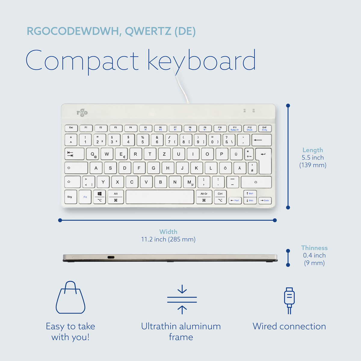 R-Go Tools Ergonomisch toetsenbord R-Go Compact Break, compact toetsenbord met pauzesoftware, QWERTZ (DE), bedraad, wit, Mini, Bedraad, USB, Schaar-toetsschakelaar, QWERTZ, Wit