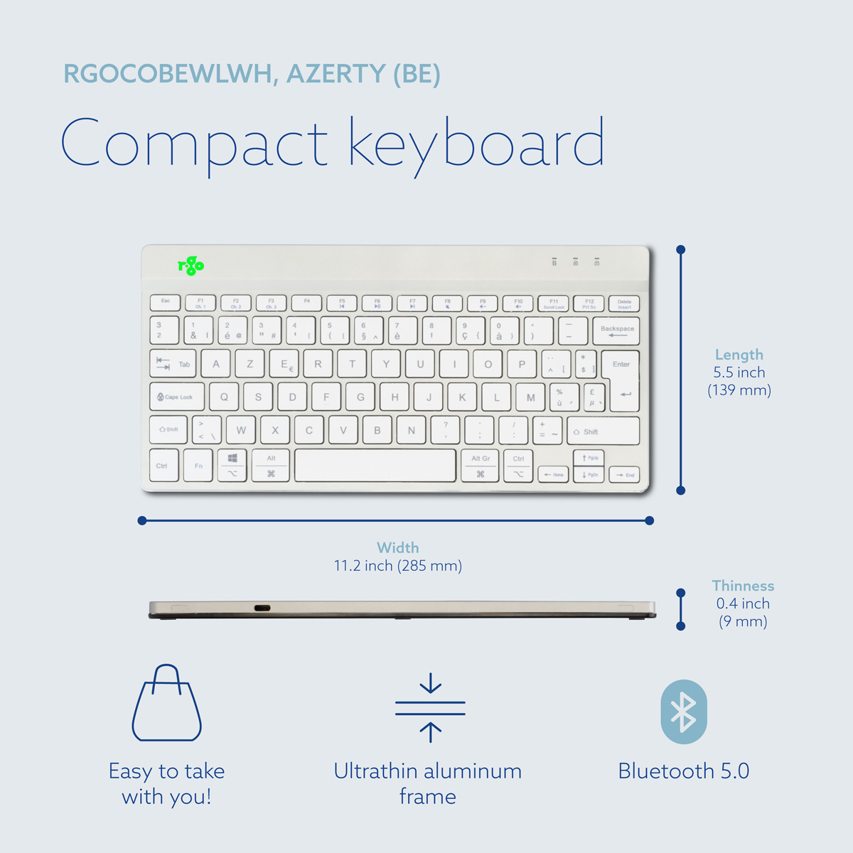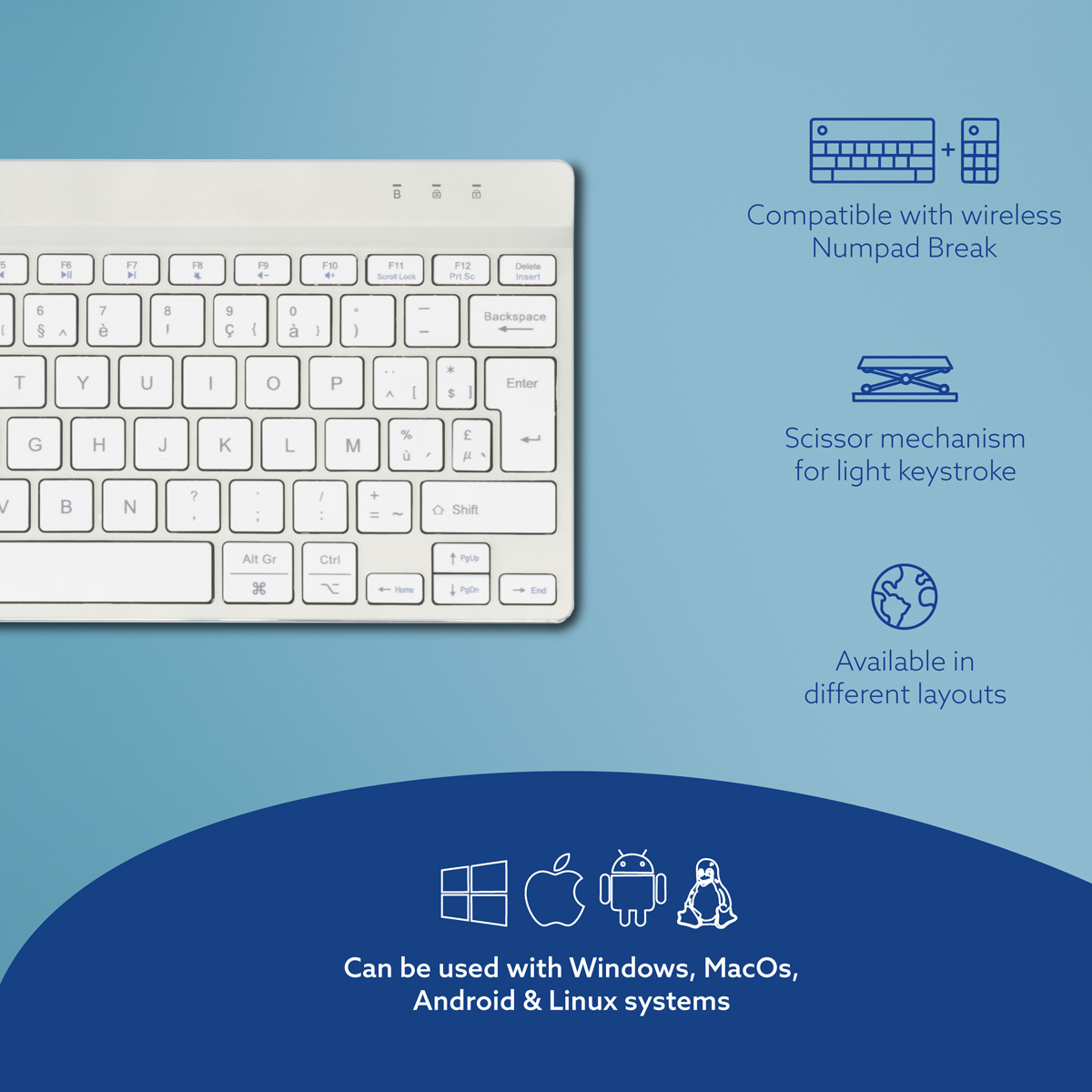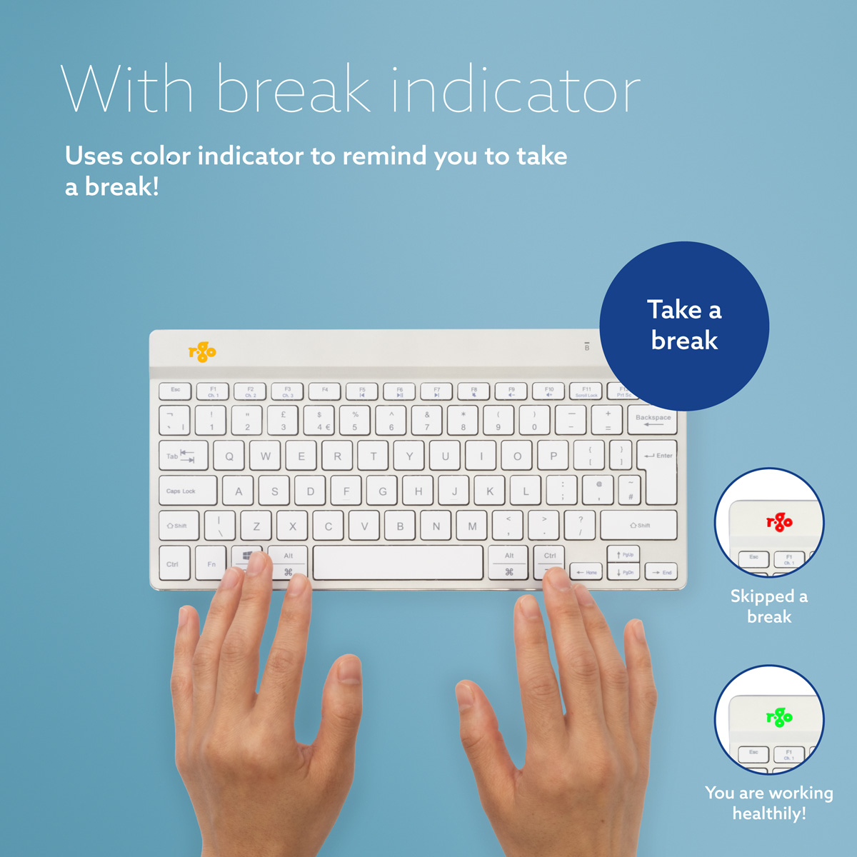 R-Go Tools Ergonomisch toetsenbord R-Go Compact Break, compact toetsenbord met pauzesoftware, AZERTY (BE), Bluetooth, wit, Mini, Draadloos, Bluetooth, Schaar-toetsschakelaar, AZERTY, Wit