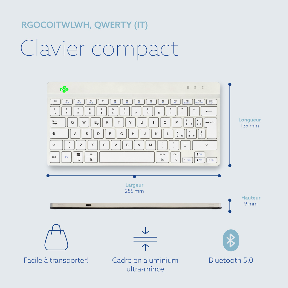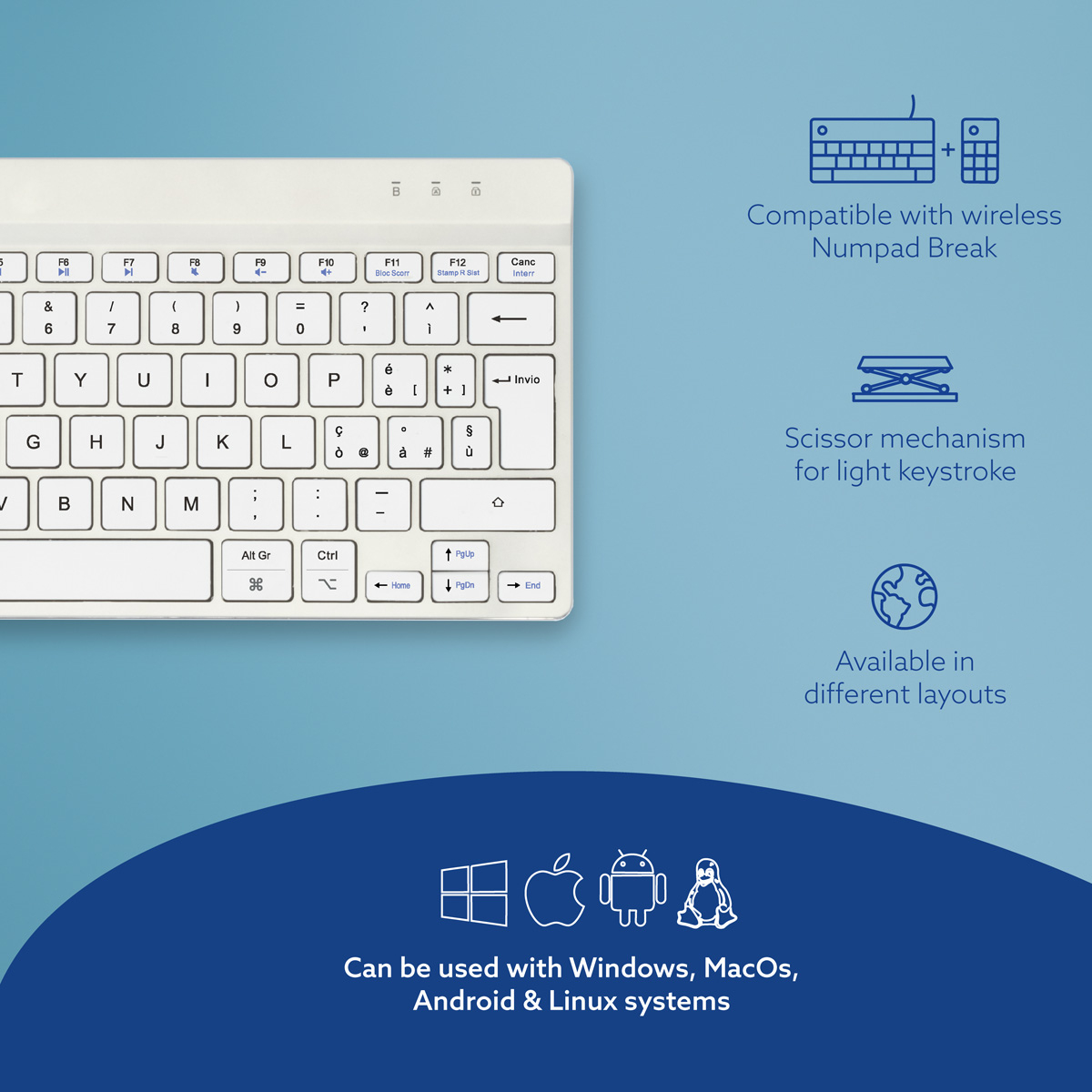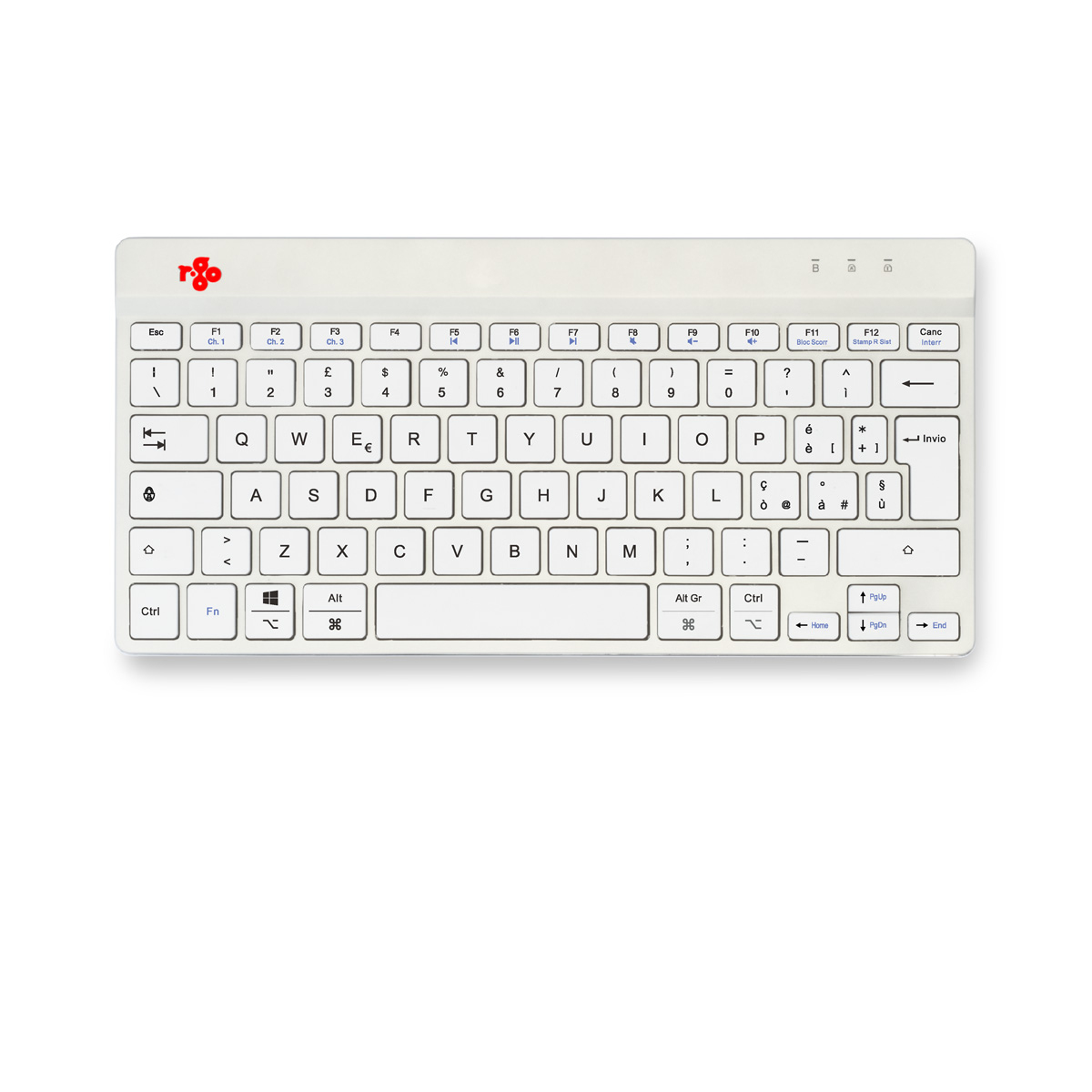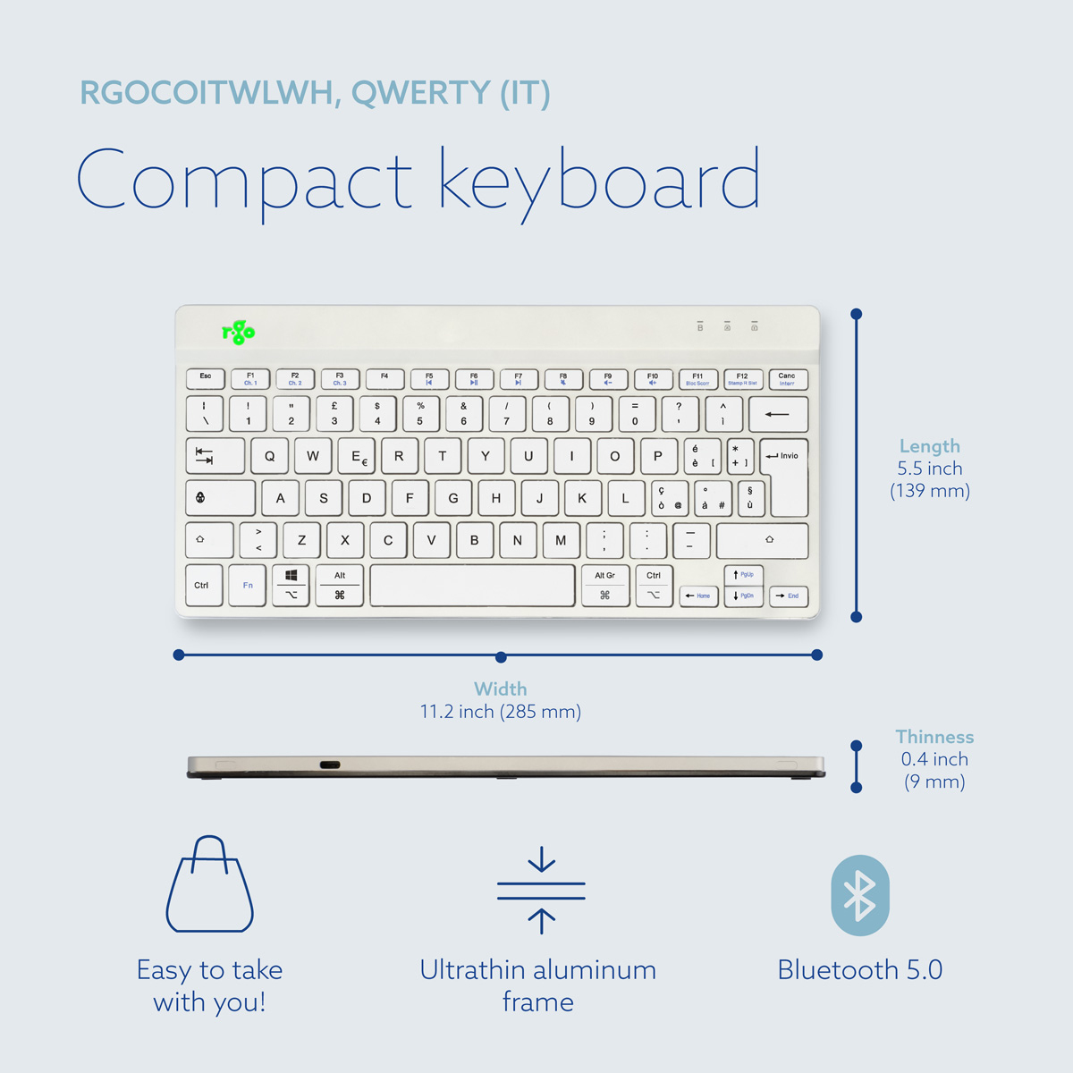 R-Go Tools Ergonomisch toetsenbord R-Go Compact Break, compact toetsenbord met pauzesoftware, QWERTY (IT), Bluetooth, wit, Mini, Draadloos, Bluetooth, Schaar-toetsschakelaar, QWERTY, Wit