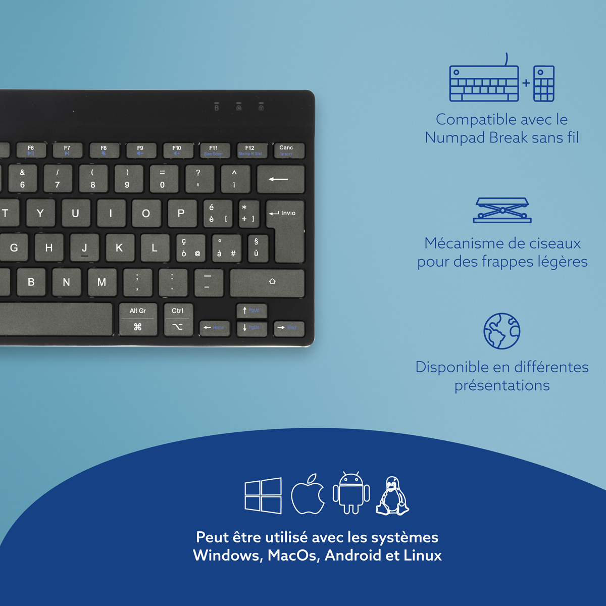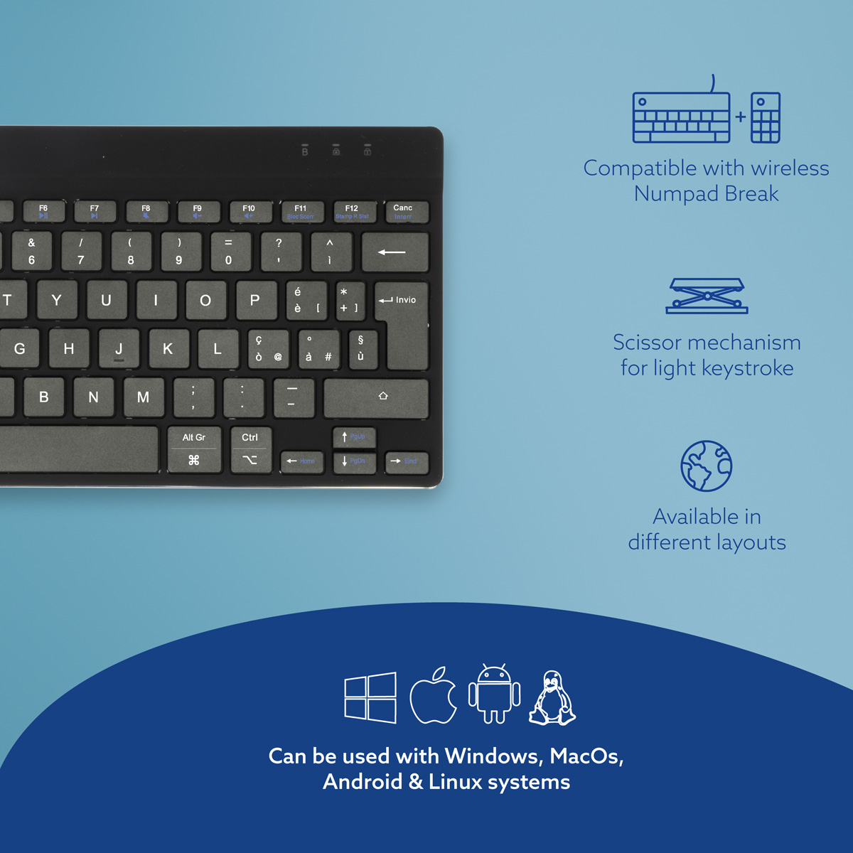 R-Go Tools Ergonomisch toetsenbord R-Go Compact Break, compact toetsenbord met pauzesoftware, QWERTY (IT), Bluetooth, zwart, Mini, Draadloos, Bluetooth, Schaar-toetsschakelaar, QWERTY, Zwart