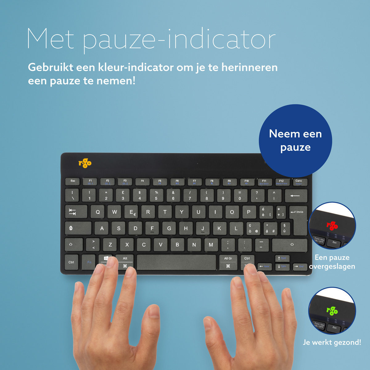 Dit compacte toetsenbord beschikt over alle ergonomische kenmerken om gezond te kunnen typen. Het compacte design zorgt ervoor dat je handen bij gelijktijdig gebruik van toetsenbord en muis altijd binnen schouderbreedte blijven. De lichte toetsaanslag vermindert de spierspanning tijdens het typen. Het toetsenbord is ultradun, zodat je handen en polsen tijdens het typen in een ontspannen, natuurlijke stand staan. Dit zorgt voor een betere doorbloeding van je handen. Het R-Go Compact Break toetsenbord geeft met LED- kleursignalen aan wanneer het tijd is om te pauzeren. Tijdens het typen verandert het lampje van kleur, zoals een stoplicht. Als het lampje groen oplicht, betekent het dat je gezond werkt. Oranje geeft aan dat het tijd is voor een korte pauze en rood dat je te lang hebt doorgewerkt. Met het inlassen van korte pauzes tijdens je werkdag zal je concentratie verhogen, voorkom je overbelastingklachten en blijf je fit tijdens je werkdag.Dit product werkt samen met de R-Go Break Software dat de Benelux Office Products Award 2021 heeft gewonnen.