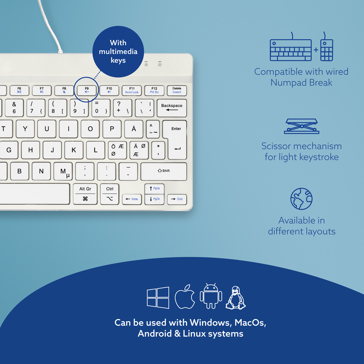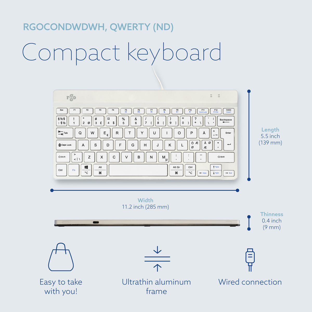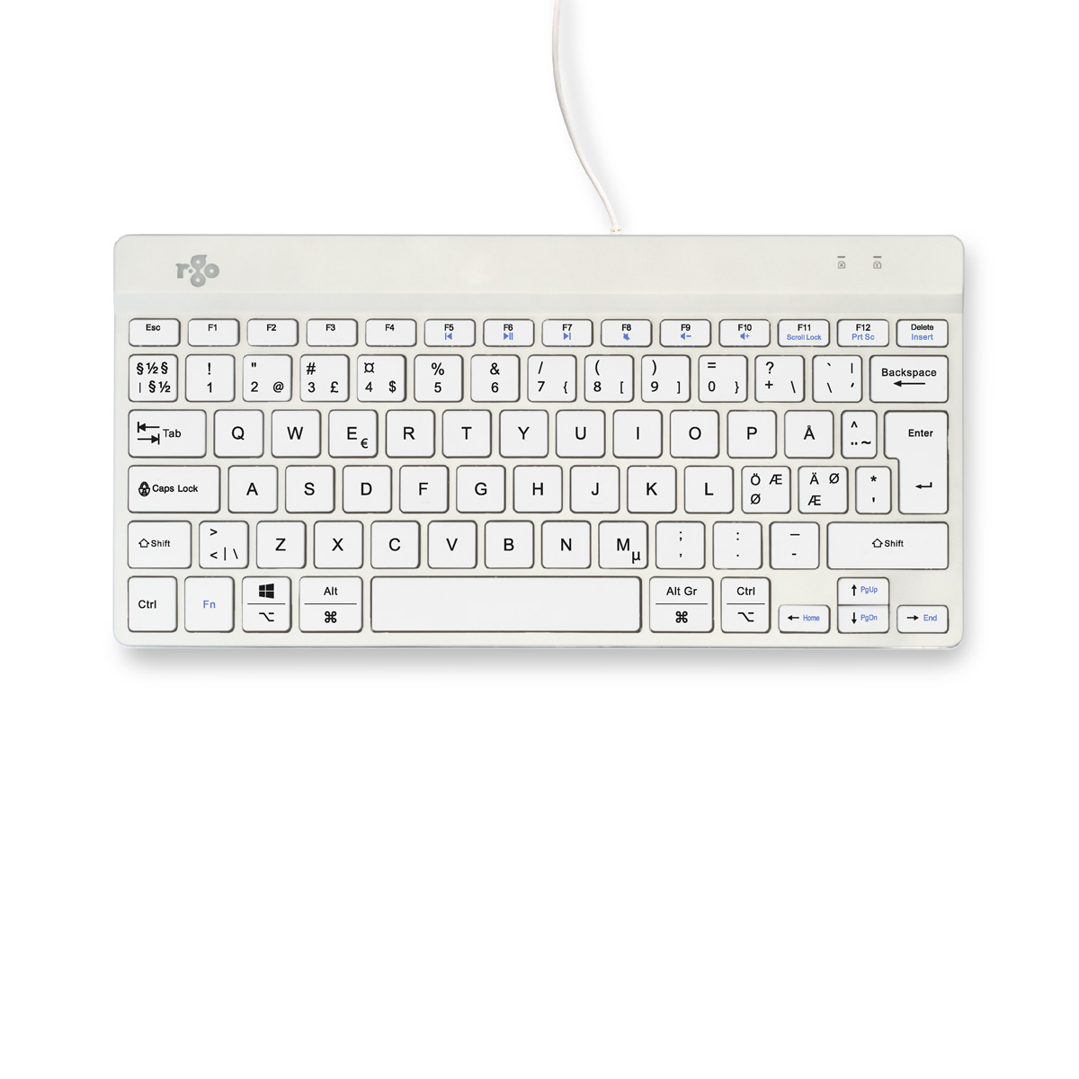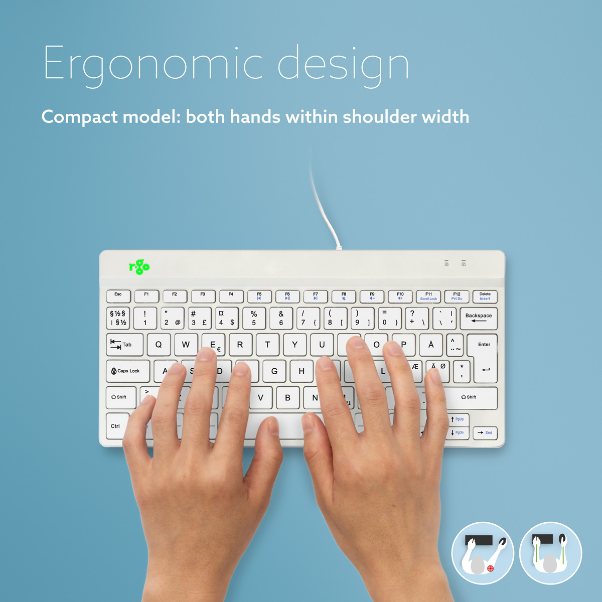 R-Go Tools Ergonomisch toetsenbord R-Go Compact Break, compact toetsenbord met pauzesoftware, QWERTY (NORDIC), bedraad, zwart, Mini, Bedraad, USB, Schaar-toetsschakelaar, QWERTY, Wit