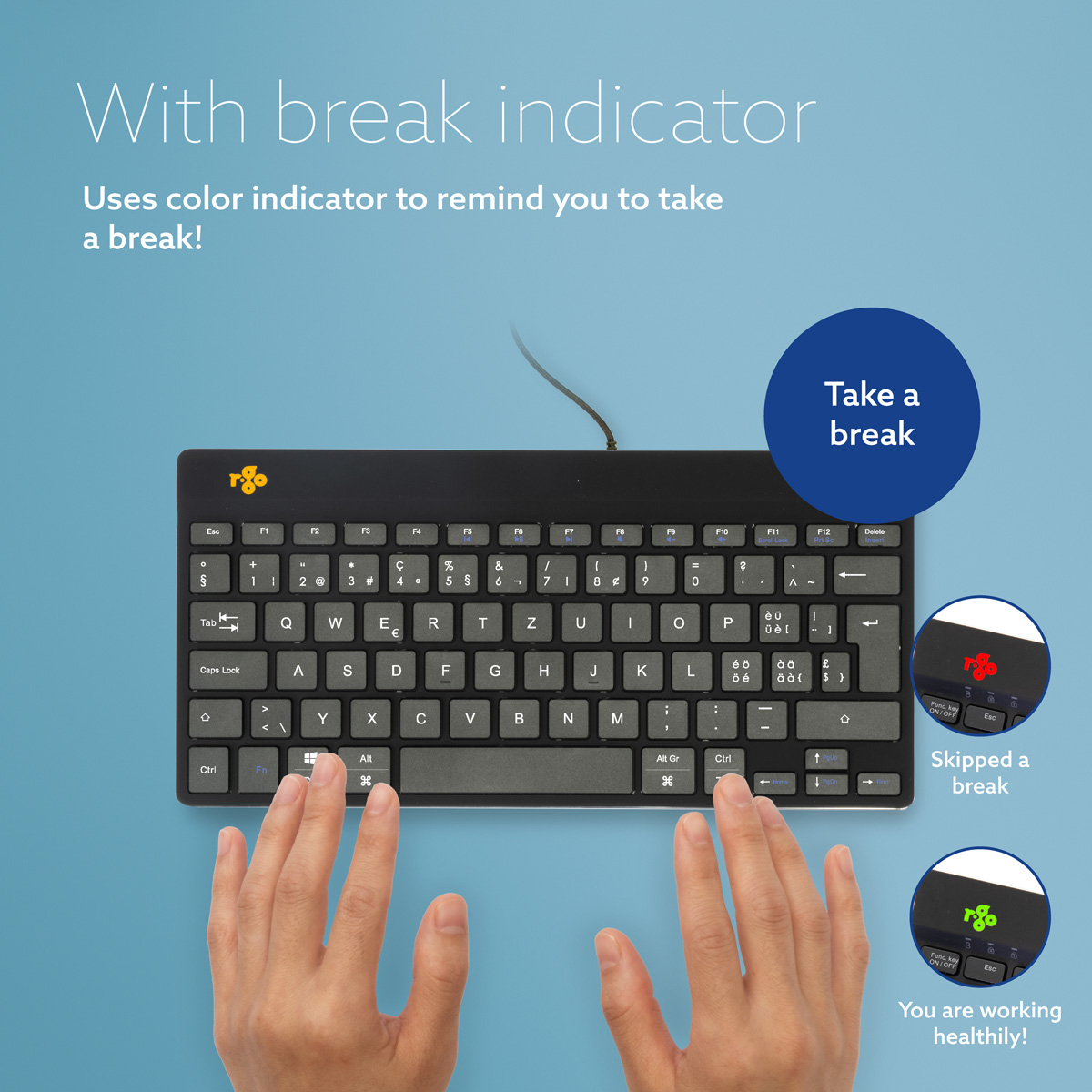 Dit compacte toetsenbord beschikt over alle ergonomische kenmerken om gezond te kunnen typen. Het compacte design zorgt ervoor dat je handen bij gelijktijdig gebruik van toetsenbord en muis altijd binnen schouderbreedte blijven. De lichte toetsaanslag vermindert de spierspanning tijdens het typen. Het toetsenbord is ultradun, zodat je handen en polsen tijdens het typen in een ontspannen, natuurlijke stand staan. Dit zorgt voor een betere doorbloeding van je handen. Het R-Go Compact Break toetsenbord geeft met LED- kleursignalen aan wanneer het tijd is om te pauzeren. Tijdens het typen verandert het lampje van kleur, zoals een stoplicht. Als het lampje groen oplicht, betekent het dat je gezond werkt. Oranje geeft aan dat het tijd is voor een korte pauze en rood dat je te lang hebt doorgewerkt. Met het inlassen van korte pauzes tijdens je werkdag zal je concentratie verhogen, voorkom je overbelastingklachten en blijf je fit tijdens je werkdag.Dit product werkt samen met de R-Go Break Software dat de Benelux Office Products Award 2021 heeft gewonnen.