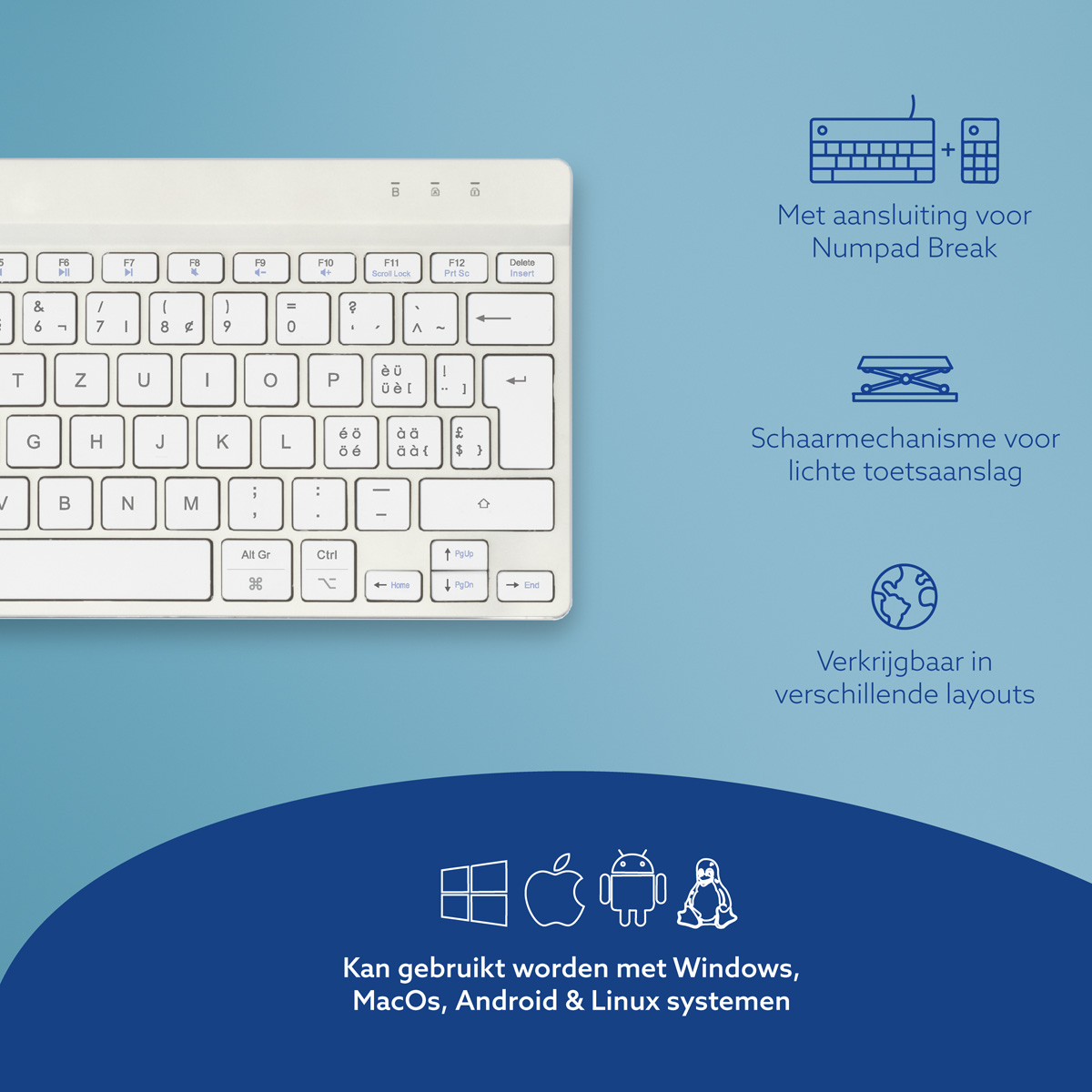 Dit compacte toetsenbord beschikt over alle ergonomische kenmerken om gezond te kunnen typen. Het compacte design zorgt ervoor dat je handen bij gelijktijdig gebruik van toetsenbord en muis altijd binnen schouderbreedte blijven. De lichte toetsaanslag vermindert de spierspanning tijdens het typen. Het toetsenbord is ultradun, zodat je handen en polsen tijdens het typen in een ontspannen, natuurlijke stand staan. Dit zorgt voor een betere doorbloeding van je handen. Het R-Go Compact Break toetsenbord geeft met LED- kleursignalen aan wanneer het tijd is om te pauzeren. Tijdens het typen verandert het lampje van kleur, zoals een stoplicht. Als het lampje groen oplicht, betekent het dat je gezond werkt. Oranje geeft aan dat het tijd is voor een korte pauze en rood dat je te lang hebt doorgewerkt. Met het inlassen van korte pauzes tijdens je werkdag zal je concentratie verhogen, voorkom je overbelastingklachten en blijf je fit tijdens je werkdag.Dit product werkt samen met de R-Go Break Software dat de Benelux Office Products Award 2021 heeft gewonnen.
