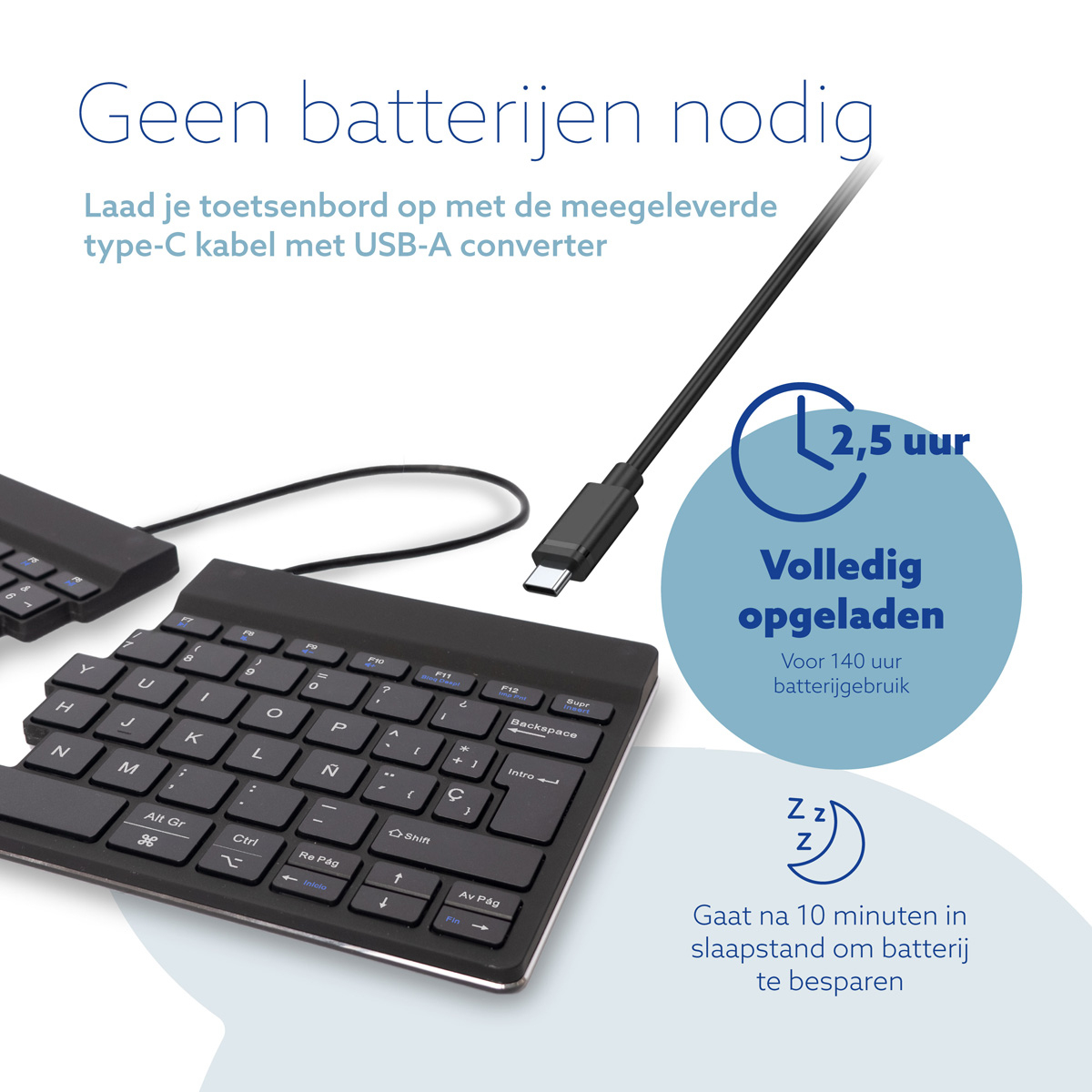 Het R-Go Split Break toetsenbord is een ergonomisch gesplitst toetsenbord met geïntegreerde pauzesoftware. Dit toetsenbord stimuleert je om regelmatig pauzes te nemen. Zo blijft de doorbloeding van je lichaam op peil, voorkom je overbelasting en blijf je fit tijdens je werkdag. Het toetsenbord bestaat uit twee losse delen, die je elk in gewenste opstelling kunt plaatsen. Dit splitsen voorkomt een knik in de polsen tijdens het typen. Typen met rechte polsen verlaagt de spierspanning en voorkomt afknelling van pezen en bloedvaten. Door de ingebouwde magneet kun je de twee afzonderlijke delen van het toetsenbord met 1 beweging veranderen in een compact toetsenbord. Het compacte formaat zorgt ervoor dat de muis altijd binnen handbereik ligt. Door de lichte toetsaanslag is er minimale spierspanning aanwezig tijdens het typen. Het toetsenbord is vlak, waardoor je handen en polsen tijdens het typen plat en ontspannen zijn.De LED- kleursignalen in het toetsenbord geven aan hoe gezond je werkt en wanneer het tijd is voor een pauze. Tijdens het typen verandert het lampje van kleur, zoals een stoplicht. Groen betekent ‘goed bezig’, oranje dat het tijd is voor een pauze, rood dat je te lang hebt doorgewerkt. Door deze subtiele kleursignalen ontvang je op een eenvoudige en positieve wijze feedback over je pauzegedrag. Dit product werkt samen met de R-Go Break Software dat de Benelux Office Product Award 2021 heeft gewonnen.