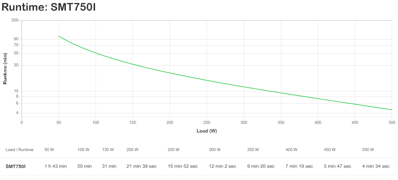 De te verwachten accuduur lees je eenvoudig af in de runtime grafiek, je vindt deze terug tussen de productafbeeldingen. Je kunt zo eenvoudig zien hoelang de ups bij een bepaalde belasting noodstroom levert.
